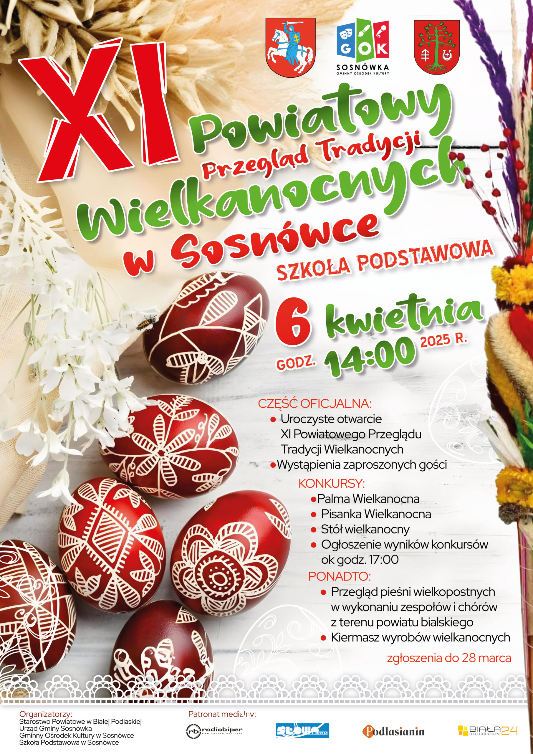 Starostwo Powiatowe w Białej Podlaskiej, Wójt Gminy Sosnówka oraz Gminny Ośrodek Kultury w Sosnówce serdecznie zapraszają do wzięcia udziału w XI Powiatowym Przeglądzie Tradycji Wielkanocnych, który odbędzie się 6 kwietnia 2025 roku o godzinie 14.00 w Szkole Podstawowej w Sosnówce.