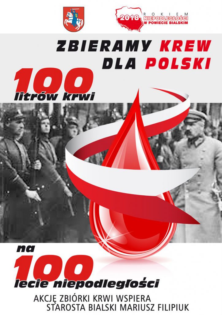 W związku z obchodami 100-lecia odzyskania przez Polskę niepodległości Rada Powiatu w Białej Podlaskiej przyjęła stanowisko o ustanowieniu roku 2018 Rokiem Niepodległości w Powiecie Bialskim. Do 11 listopada, czyli głównych uroczystości, na terenie powiatu odbędzie się szereg wydarzeń kulturalnych, sportowych i społecznych. Jedną z nich będzie akcja zbiórki krwi „Zbieramy krew dla Polski. 100 litrów krwi na 100-lecie niepodległości”, której organizację wsparł starosta bialski Mariusz Filipiuk. W ciągu najbliższych miesięcy będzie ona przeprowadzona kilkukrotnie w różnych gminach powiatu.