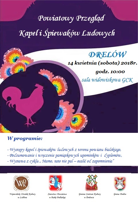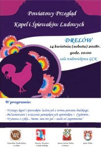 Gminne Centrum Kultury w Drelowie zaprasza na Powiatowy Przegląd Kapel i Śpiewaków Ludowych w Drelowie, który odbędzie się 14 kwietnia 2018r. ( sobota) o godz. 10:00
