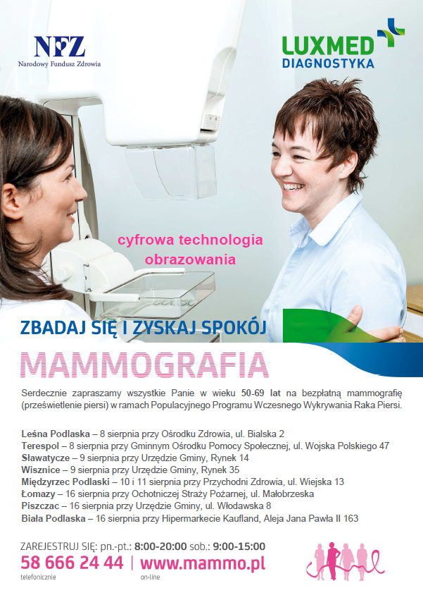 Bezpłatne badania mammograficzne w mammobusach odbędą się: