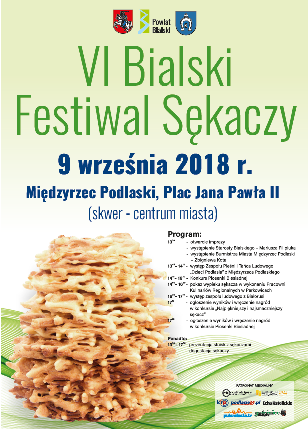 Już po raz szósty odbędzie się Bialski Festiwal Sękaczy. Starosta bialski Mariusz Filipiuk oraz burmistrz miasta Międzyrzec Podlaski Zbigniew Kot zapraszają na 9 września br. do Międzyrzeca Podlaskiego. Wstęp wolny. Szczegóły na poniższym plakacie.
