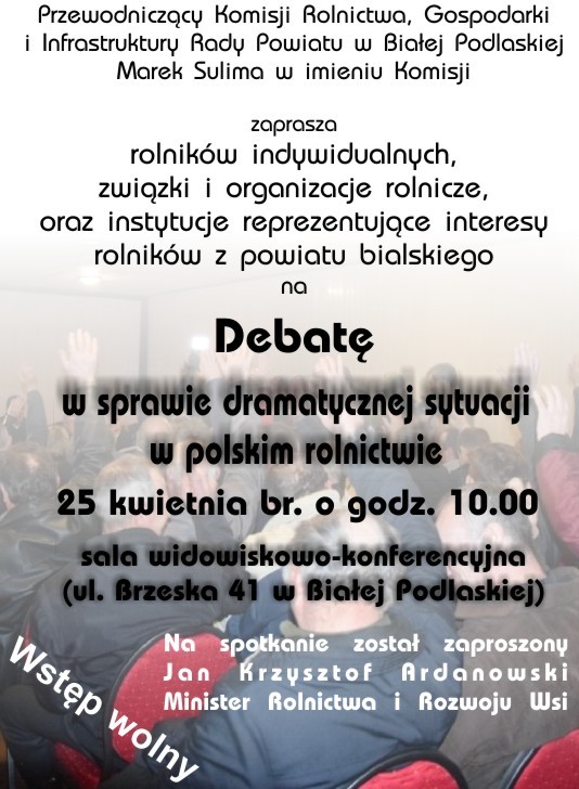 Przewodniczący Komisji Rolnictwa, Gospodarki i Infrastruktury Rady Powiatu w Białej Podlaskiej Marek Sulima w imieniu Komisji zaprasza rolników indywidualnych, związki i organizacje rolnicze, oraz instytucje reprezentujące interesy rolników z powiatu bialskiego na Debatę sprawie dramatycznej sytuacji w polskim rolnictwie.