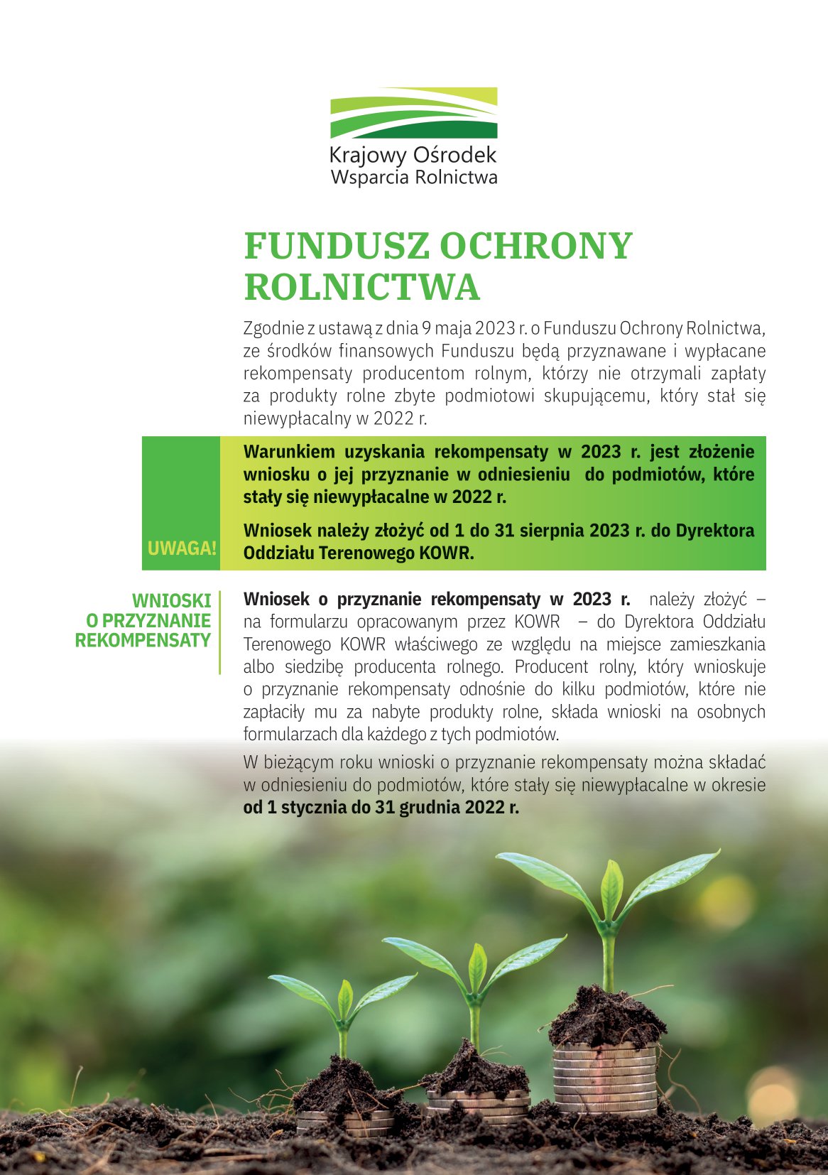 Fundusz Ochrony Rolnictwa 31 lipca 2023 / Przez Tomasz Grzybowski Ustawa_z_dnia_9_maja_2023_r_o_Funduszu_Ochrony_Rolnictwa Więcej informacji o Funduszu Ochrony Rolnictwa znajdziecie Państwo na stronie internetowej: https://www.gov.pl/web/kowr/fundusz-ochrony-rolnictwa