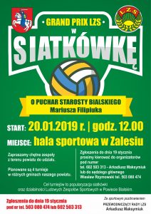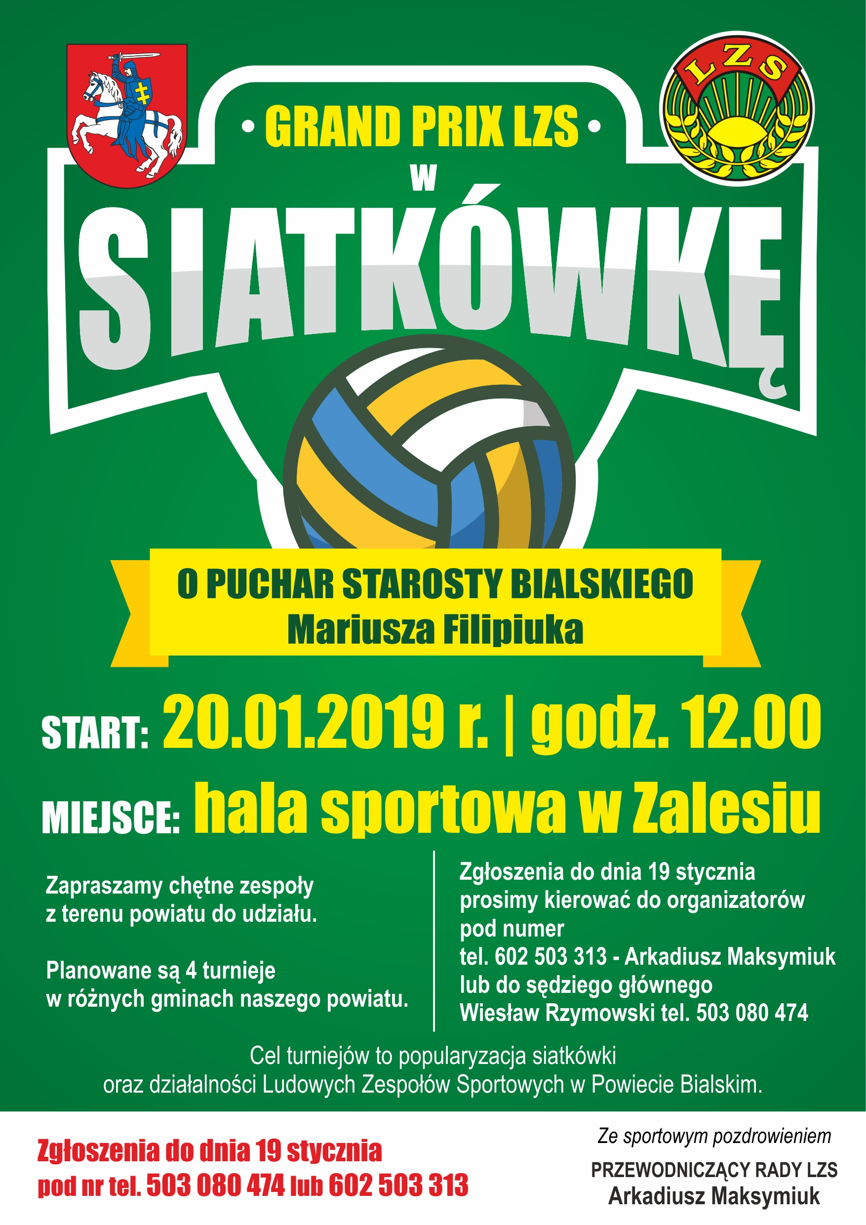 Starostwo Powiatowe w Białej Podlaskiej i Powiatowe Zrzeszenie LZS w Białej Podlaskiej z/s w Zalesiu zapraszają chętne zespoły z terenu powiatu bialskiego do uczestnictwa Grand Prix w Piłkę Siatkową. Pierwszy turniej w Zalesiu dn. 20.01.2019 r.