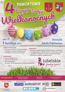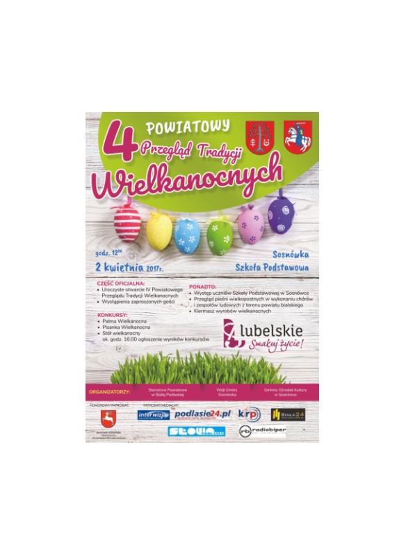 Starostwo Powiatowe w Białej Podlaskiej, Wójt Gminy Sosnówka oraz Gminny Ośrodek Kultury w Sosnówce serdecznie zapraszają do wzięcia udziału w IV Powiatowym Przeglądzie Tradycji Wielkanocnych, który odbędzie się 2 kwietnia 2017 roku w Szkole Podstawowej w Sosnówce.