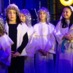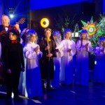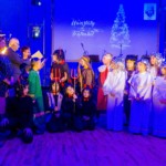 Następnie zaprezentowano kolejne dzieła również stworzone przez dziewczęta, które uczestniczyły w warsztatach tworzenia szopek Bożonarodzeniowych. Powstały szopki: Krakowska, Palestyńska i Szopka Góralską. Barwne zdobienia połączone z prostotą i ubóstwem żłóbka zachwycały zgromadzonych. Trud trzymiesięcznych warsztatów został nagrodzony gromkimi brawami. Trener włożył ogromną prace aby razem z dziewczętami cieszyć się sukcesem. Przed sceną pomiędzy choinkami w scenerii zimowej pojawiła się młodzież ze Szkoły Podstawowej nr.1 prezentując jako dorobek warsztatowy przedstawienie Bożonarodzeniowe, która powstało na warsztatach prowadzonych przez Edytę Krzemińską i Elizę Lańską. Ach cóż to był za występ, braw nie było końca. Żywiołowe sceny spektaklu, fantazja i pomysłowość zaowocowały pięknym widowiskiem. Wszyscy a w szczególności rodzice byli pełni zachwytu z występu swoich pociech.