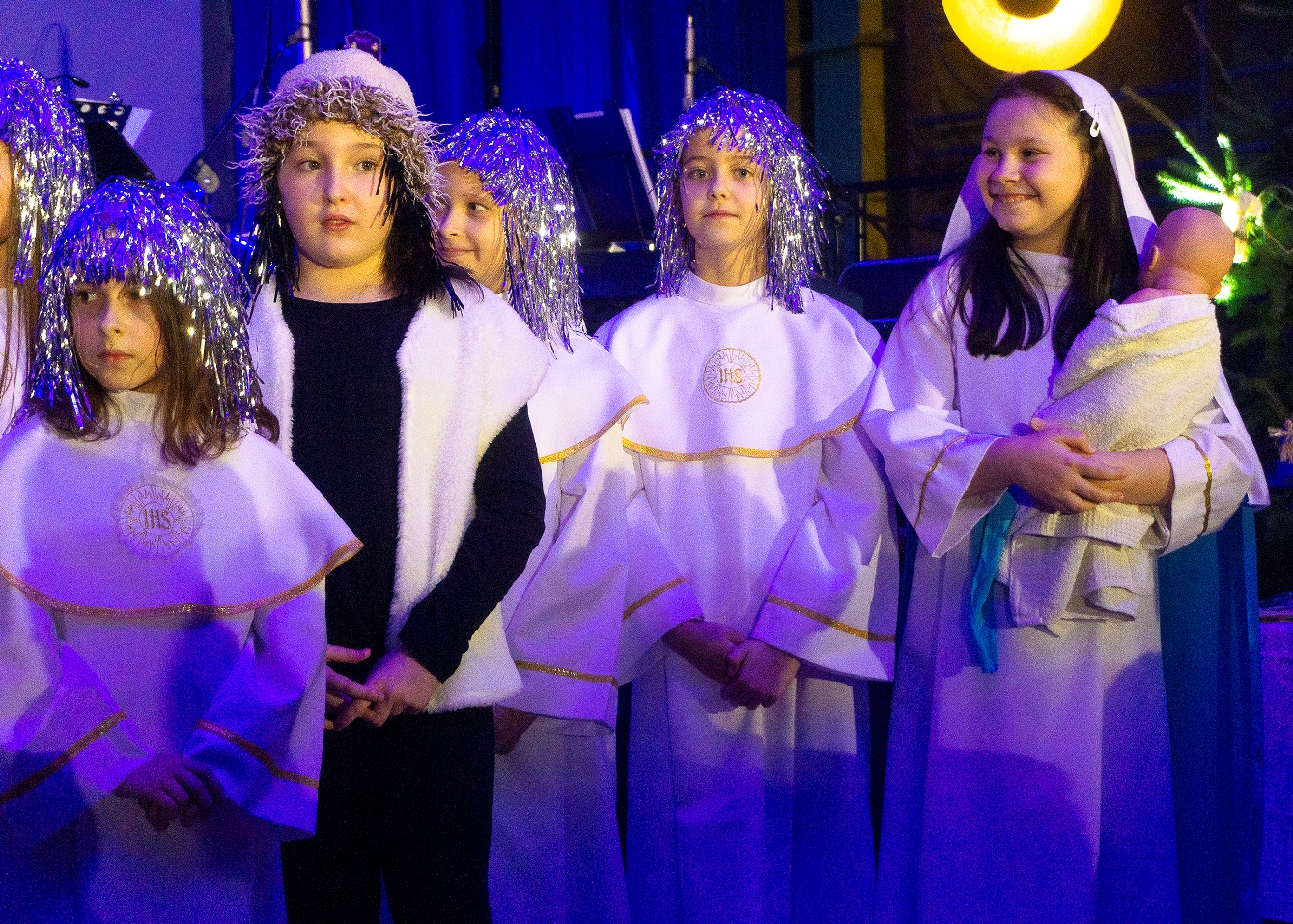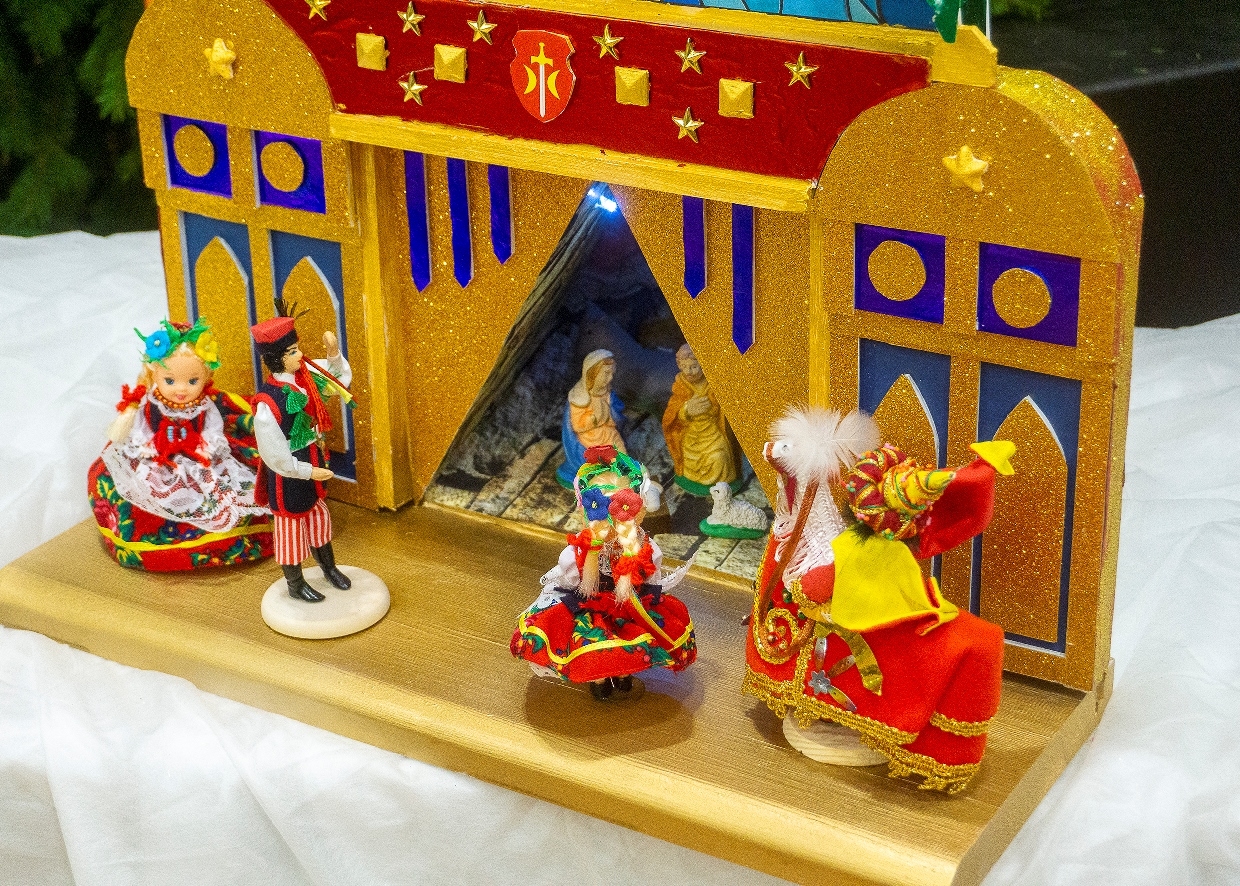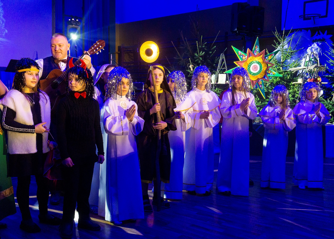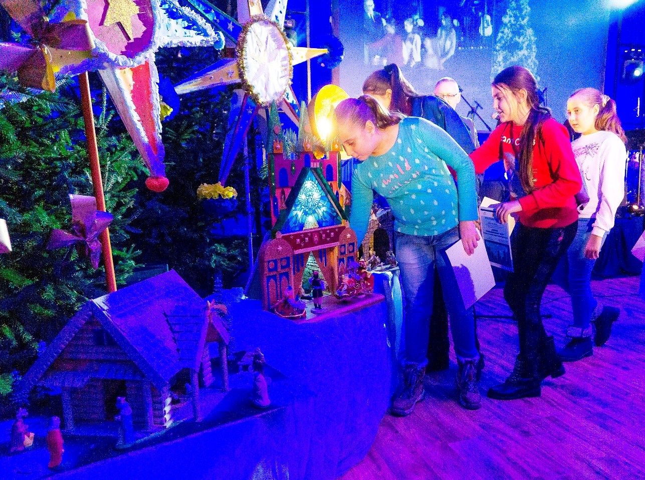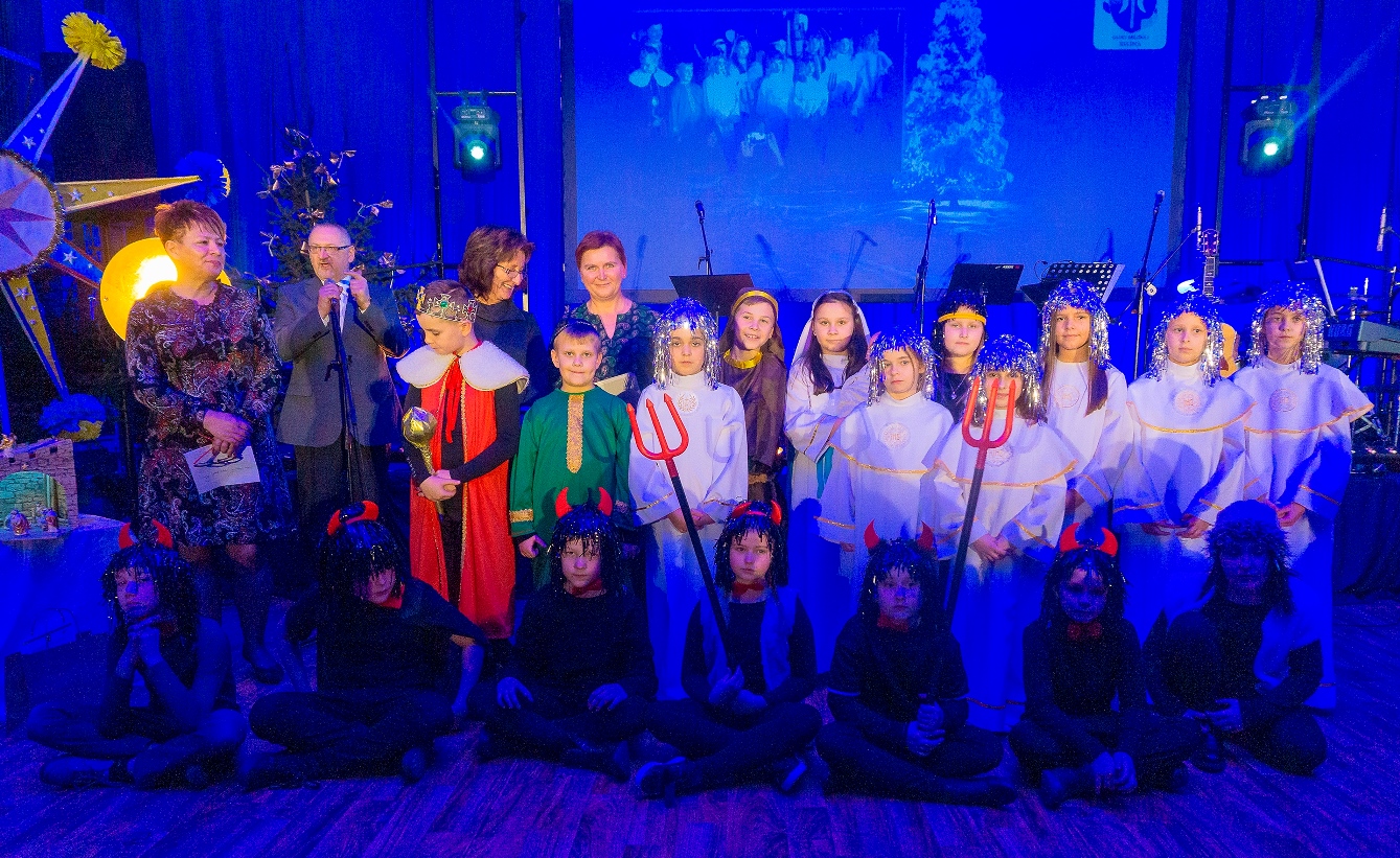 Następnie zaprezentowano kolejne dzieła również stworzone przez dziewczęta, które uczestniczyły w warsztatach tworzenia szopek Bożonarodzeniowych. Powstały szopki: Krakowska, Palestyńska i Szopka Góralską. Barwne zdobienia połączone z prostotą i ubóstwem żłóbka zachwycały zgromadzonych. Trud trzymiesięcznych warsztatów został nagrodzony gromkimi brawami. Trener włożył ogromną prace aby razem z dziewczętami cieszyć się sukcesem. Przed sceną pomiędzy choinkami w scenerii zimowej pojawiła się młodzież ze Szkoły Podstawowej nr.1 prezentując jako dorobek warsztatowy przedstawienie Bożonarodzeniowe, która powstało na warsztatach prowadzonych przez Edytę Krzemińską i Elizę Lańską. Ach cóż to był za występ, braw nie było końca. Żywiołowe sceny spektaklu, fantazja i pomysłowość zaowocowały pięknym widowiskiem. Wszyscy a w szczególności rodzice byli pełni zachwytu z występu swoich pociech.
