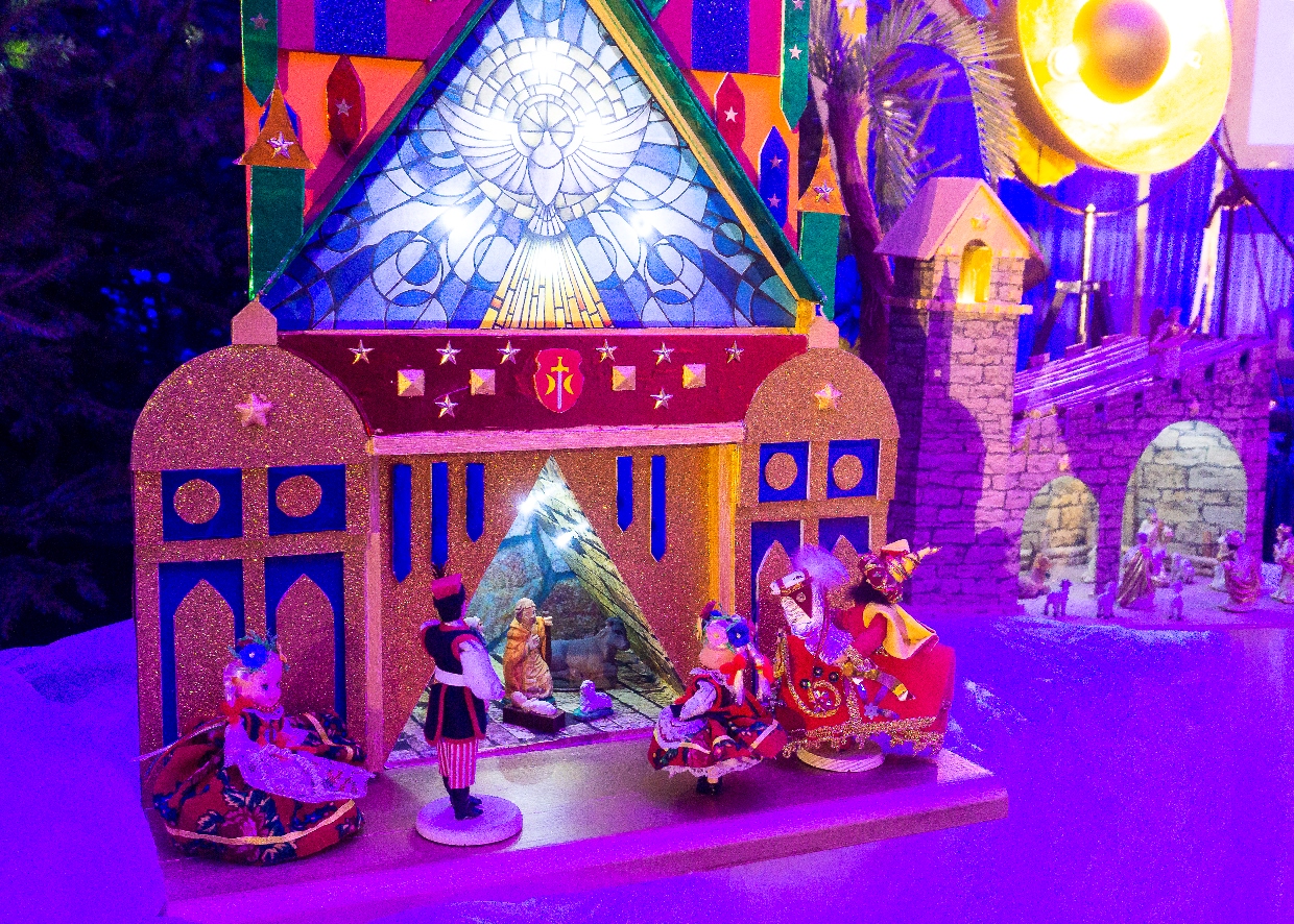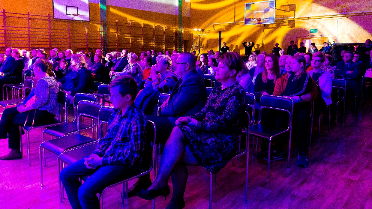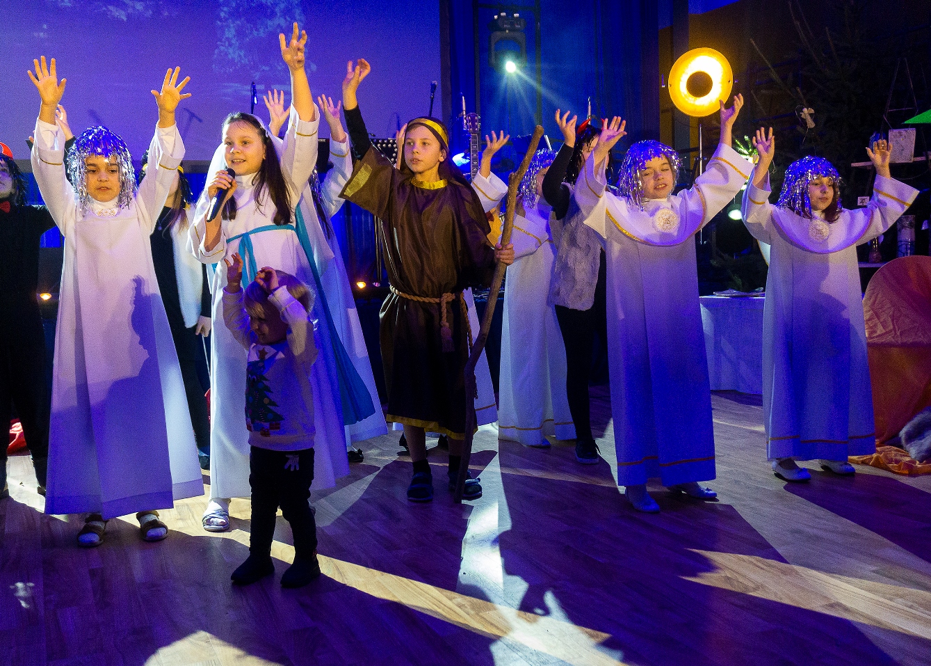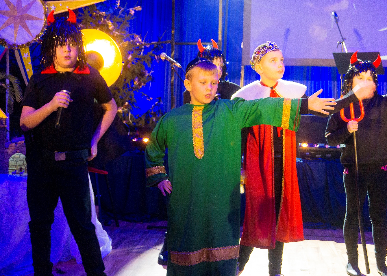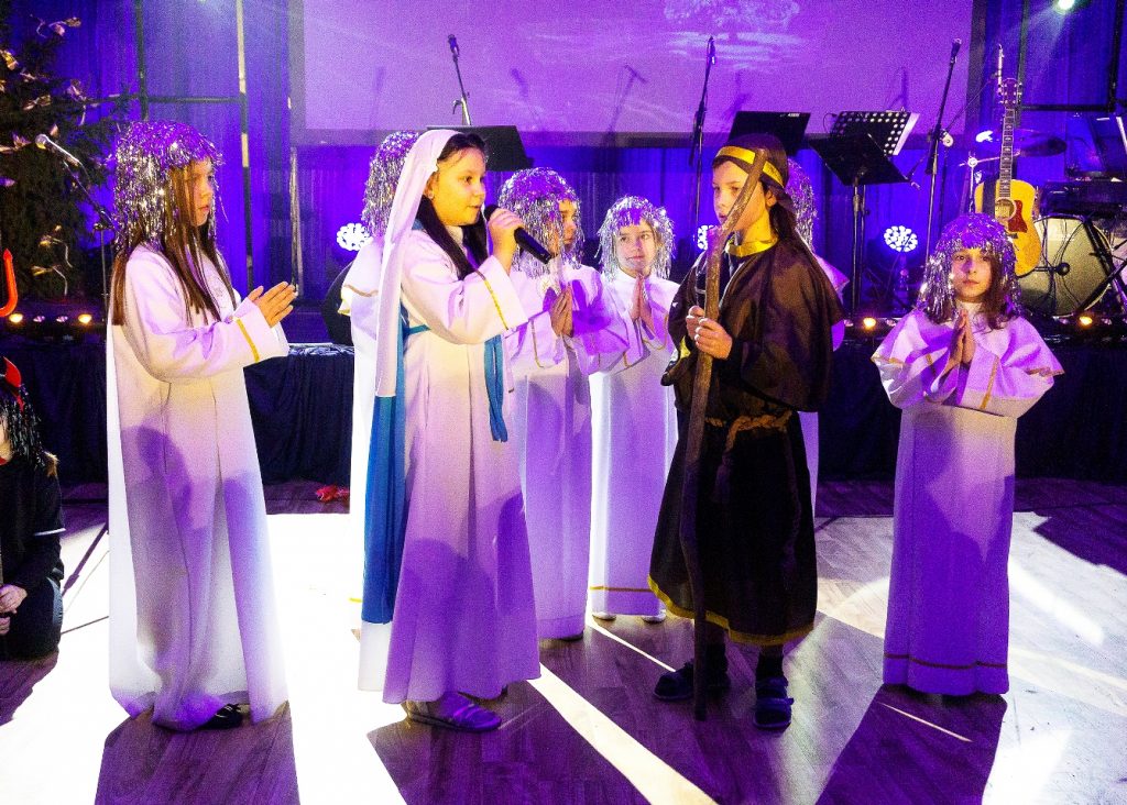 Następnie zaprezentowano kolejne dzieła również stworzone przez dziewczęta, które uczestniczyły w warsztatach tworzenia szopek Bożonarodzeniowych. Powstały szopki: Krakowska, Palestyńska i Szopka Góralską. Barwne zdobienia połączone z prostotą i ubóstwem żłóbka zachwycały zgromadzonych. Trud trzymiesięcznych warsztatów został nagrodzony gromkimi brawami. Trener włożył ogromną prace aby razem z dziewczętami cieszyć się sukcesem. Przed sceną pomiędzy choinkami w scenerii zimowej pojawiła się młodzież ze Szkoły Podstawowej nr.1 prezentując jako dorobek warsztatowy przedstawienie Bożonarodzeniowe, która powstało na warsztatach prowadzonych przez Edytę Krzemińską i Elizę Lańską. Ach cóż to był za występ, braw nie było końca. Żywiołowe sceny spektaklu, fantazja i pomysłowość zaowocowały pięknym widowiskiem. Wszyscy a w szczególności rodzice byli pełni zachwytu z występu swoich pociech.