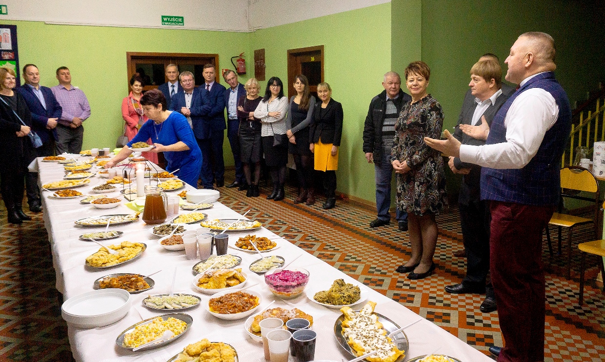 Nieopodal w szkolnej stołówce do ostatnich chwil przed finałem pracowała grupa młodzieży uczestników warsztatów kulinarnych, pod okiem Pani Grażyny Michalak i Pani Lucyny Onufrejuk młodzież przygotowywała wieczerzę wigilijną. Pierogi z kapustą, ryba, barszcz, grzyby to tradycyjne dania przygotowane na wieczerzę na której zgromadzili się uczestnicy projektu i ich goście.