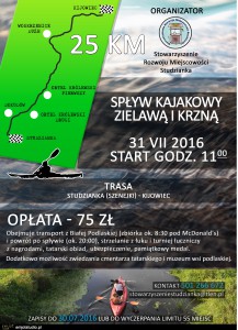 W związku z dużym zainteresowaniem ostatnimi spływami kajakowymi rzeką Zielawą Stowarzyszenie Rozwoju Miejscowości Studzianka przygotowało ofertę popłynięcia kajakiem rzekami Zielawą oraz Krzną. Spływ, na który zapraszamy wszystkich chętnych odbędzie się 31 lipca 2016 roku na trasie 25 km ze Studzianki (Szenejki) do Kijowca.