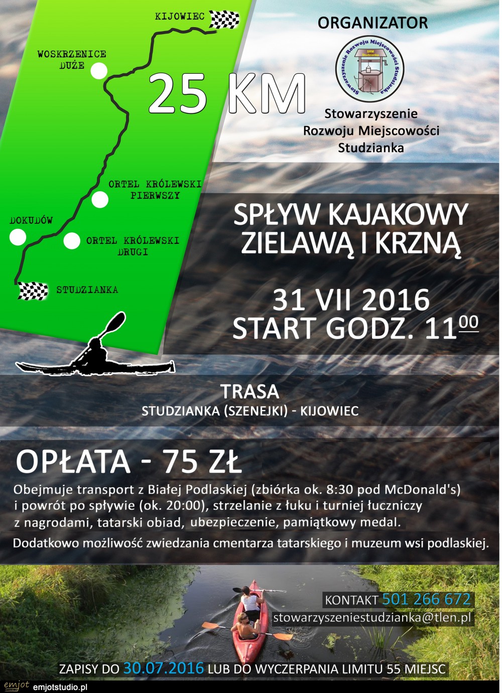 Jest to odcinek rzeki uregulowanej i nie wymaga tak wielkiego wysiłku jak trasa z Wisznic do Studzianki. Koszt udziału to 75 zł od osoby. Opłata obejmuje ubezpieczenie, przejazd z Białej Podlaskiej oraz powrót, spływ kajakiem, tatarski obiad z deserem, możliwość zwiedzania Muzeum Wsi Podlaskiej oraz tatarskiego cmentarza z przewodnikiem. Ponadto warsztaty łucznictwa tradycyjnego oraz turniej łuczniczy z nagrodami. Każdy, kto ukończy spływ otrzyma pamiątkowy medal. Na spływ obowiązuje limit miejsc. Szczegóły i zapisy do dnia 30.07.2016 r. pod numerem 501 266 672 lub poprzez email:stowarzyszeniestudzianka@tlen.pl. Zachęcamy do zapisów oraz do udziału ponieważ liczba miejsc jest ograniczona.
