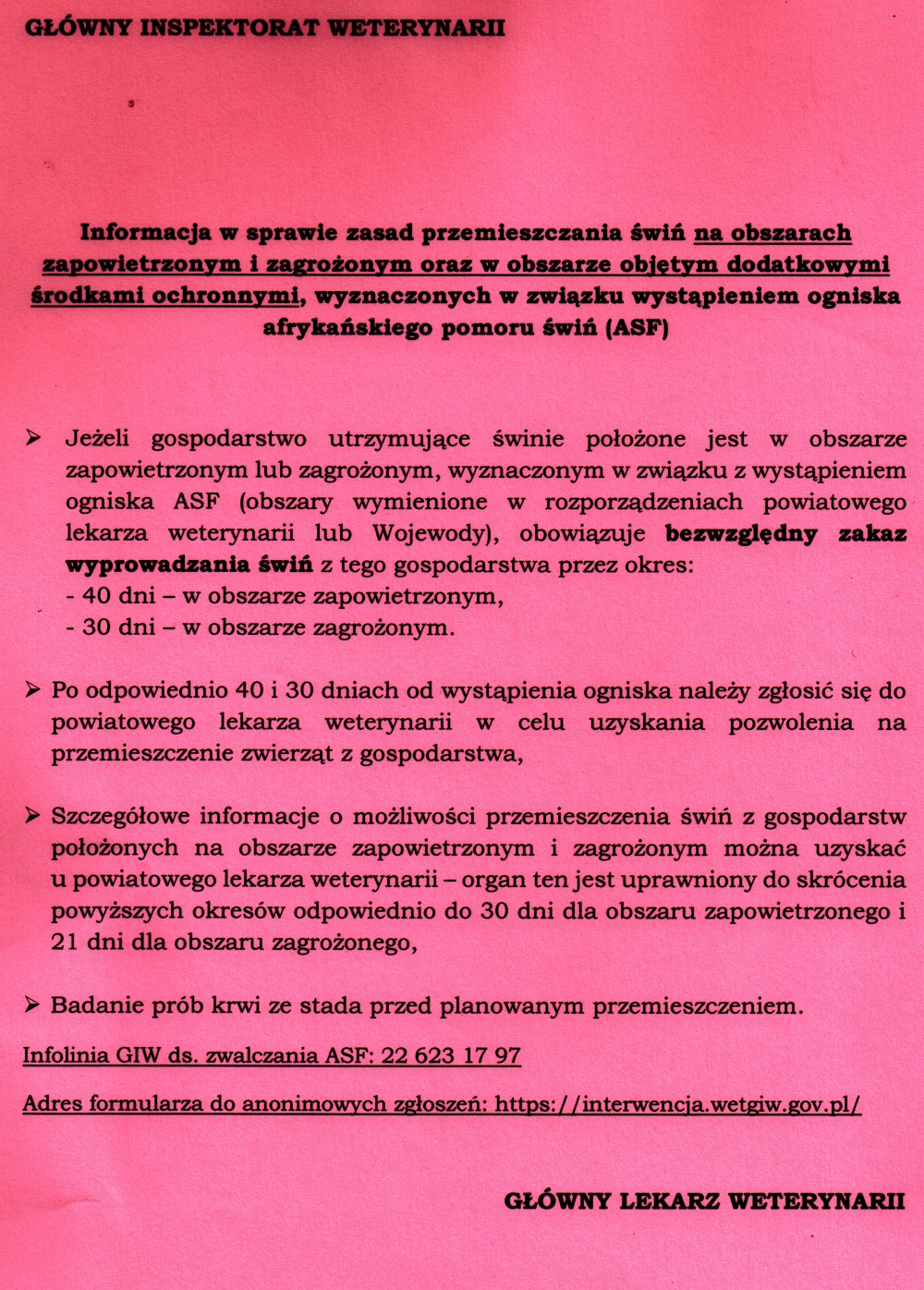 W Starostwie Powiatowym w Białej Podlaskiej 14 września odbyło się kolejne spotkanie dotyczące afrykańskiego pomoru świń. Głównymi prelegentami byli Karol Krajewski – pełnomocnik sekretarza stanu w ministerstwie Rolnictwa i Rozwoju Wsi Jacka Boguckiego oraz Jacek Kucharski – zastępca głównego lekarza weterynarii. Licznie zgromadzonym rolnikom przedstawiono informacje dotyczącą możliwości wywozu, uboju oraz sprzedaży trzody chlewnej w trzech strefach ochronnych: żółtej, niebieskiej i paskowanej. Poinformowano, że podejmowane są próby wprowadzenia mechanizmów łagodzących w zagrożonych i zapowietrzonych strefach. Pokazano także możliwości skupu świń po wcześniejszych badaniach weterynaryjnych przez Zakład w Kosowie Lackim. Niestety możliwości zakładu są ograniczone, stąd też starosta bialski Mariusz Filipiuk zwrócił się o rozpatrzenie i szybkie działanie w zakresie wystosowanego w ubiegłym tygodniu pisma do Ministra Rolnictwa i Rozwoju Wsi o umożliwienie na podstawie specustawy innym zakładom zajęcie się ubojem i przetwórstwem tuczników z terenów zagrożonych. Dyskusja ze względu na poruszany problem i bardzo trudną sytuację rolników była bardzo ożywiona. Goście zbierali uwagi i propozycje rolników, by przekazać do ministerstwa i inspektoratu weterynarii.