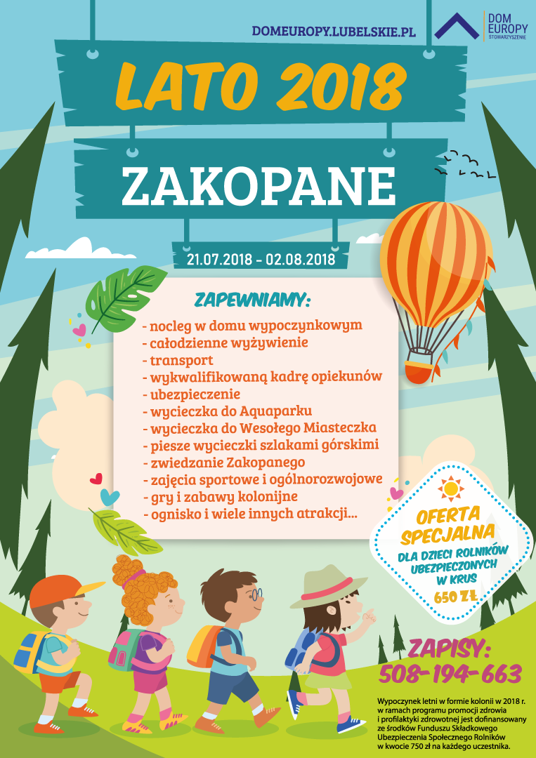 Dokumenty dotyczące kolonii letnich dostępne są na stronie: http://domeuropy.lubelskie.pl/lato-2018-kolonie-zakopanem-dla-dzieci-rolnikow