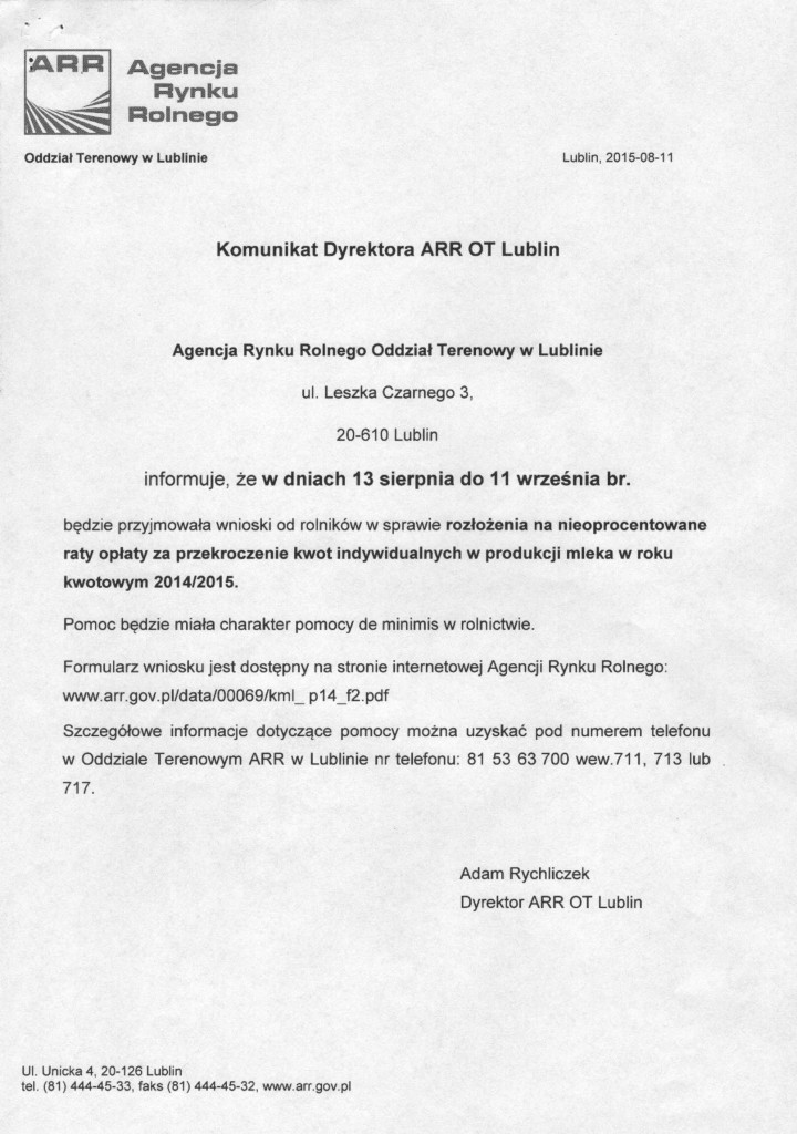 Komunikat Dyrektora ARR OT Lublin 18 sierpnia 2015 / Przez Przemysław Bierdziński Informacja dotycząca wniosków w sprawie rozłożenia na nieoprocentowane raty opłaty za przekroczenie kwot indywidualnych w produckji mleka w roku kwotowym 2014/2015.