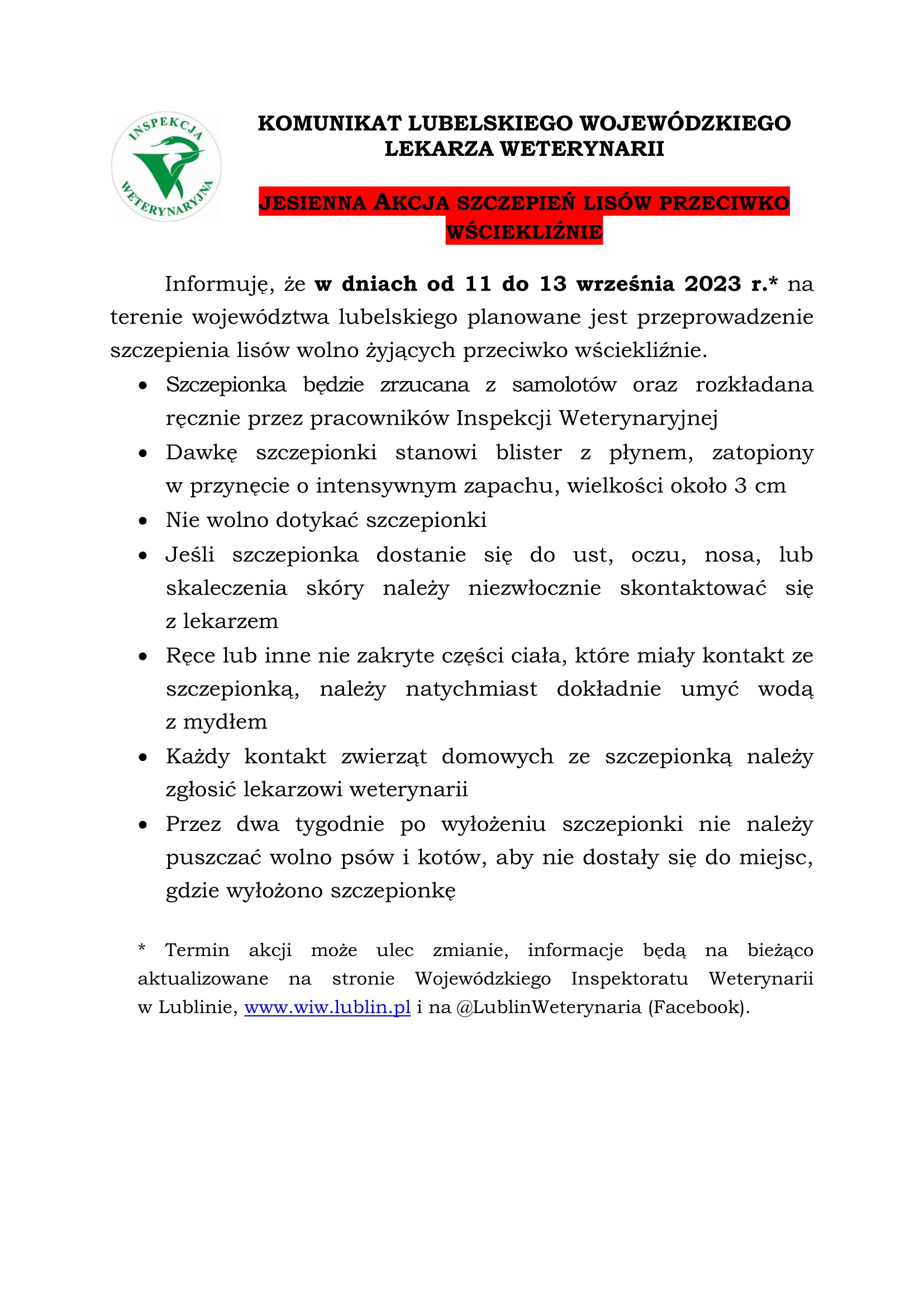 Komunikat Lubelskiego Wojewódzkiego Lekarza Weterynarii w sprawie jesiennej akcji szczepień lisów przeciwko wściekliźnie. 31 sierpnia 2023 / Przez Tomasz Grzybowski