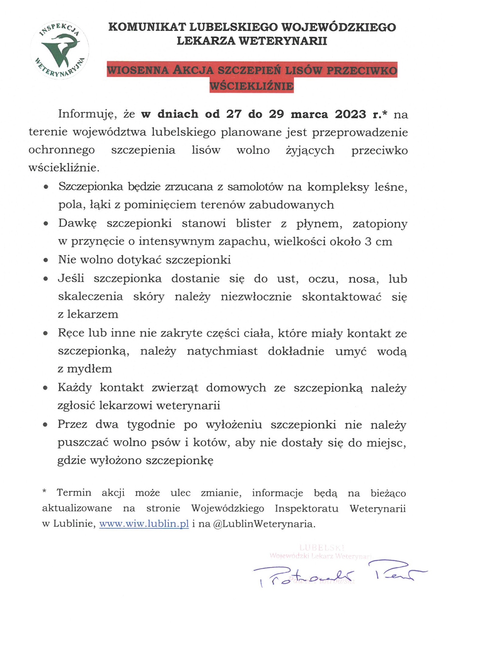 Komunikat Lubelskiego Wojewódzkiego Lekarza Weterynarii w sprawie wiosennej akcji szczepień lisów przeciwko wściekliźnie 17 marca 2023 / Przez Administrator