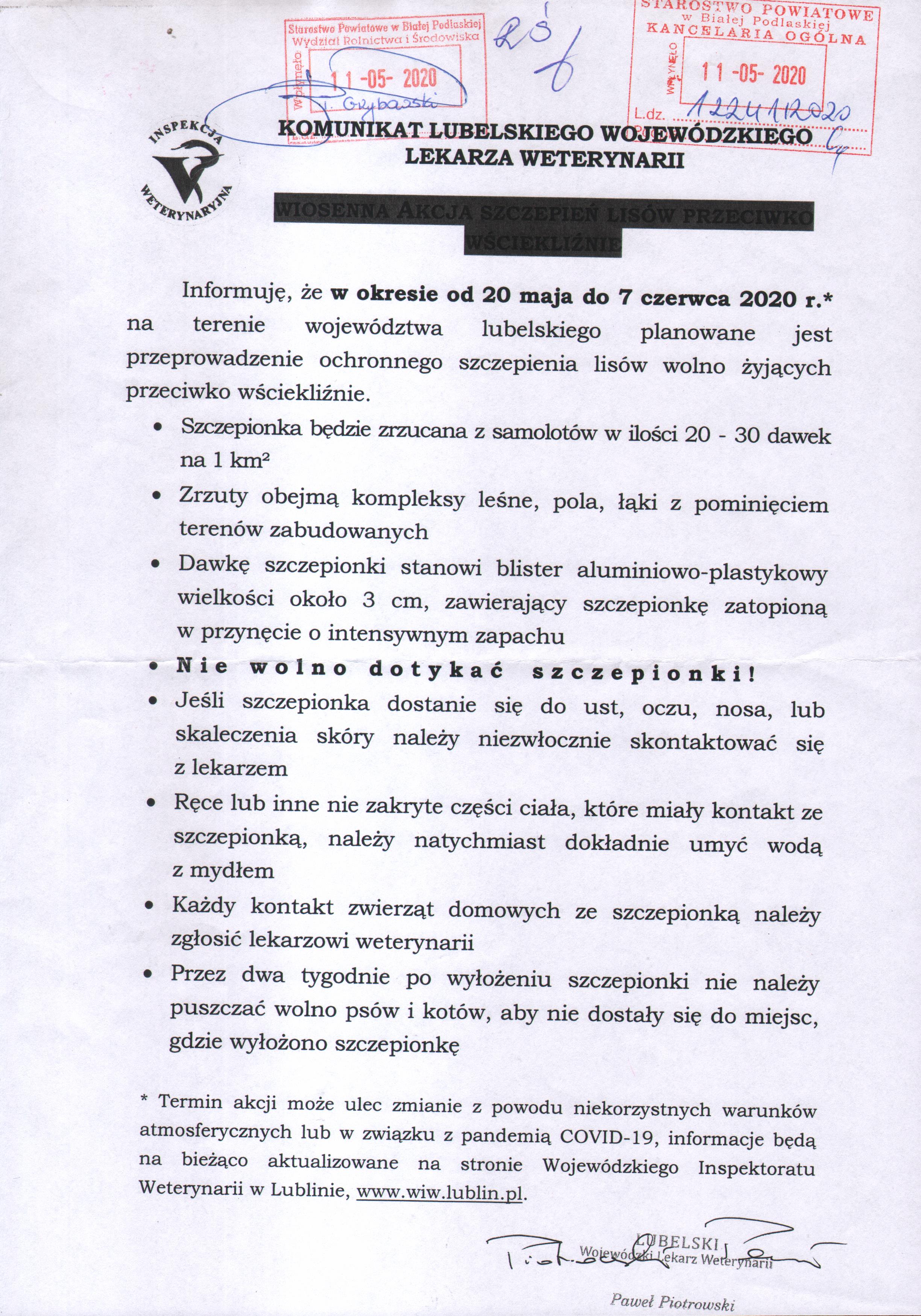 Komunikat Lubelskiego Wojewódzkiego Lekarza Weterynarii