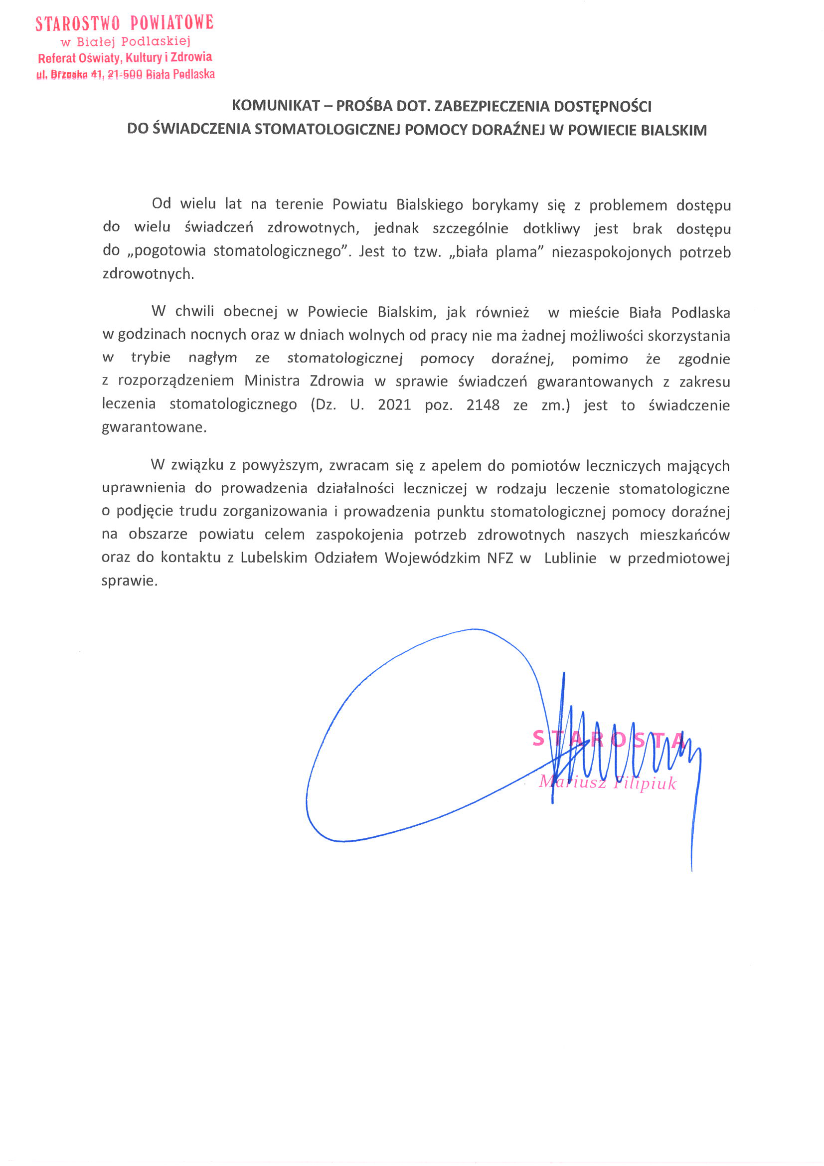 KOMUNIKAT – PROŚBA DOT. ZABEZPIECZENIA DOSTĘPNOŚCI DO ŚWIADCZENIA STOMATOLOGICZNEJ POMOCY DORAŹNEJ W POWIECIE BIALSKIM 24 lipca 2024 / Przez Anna Jureczek