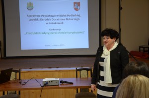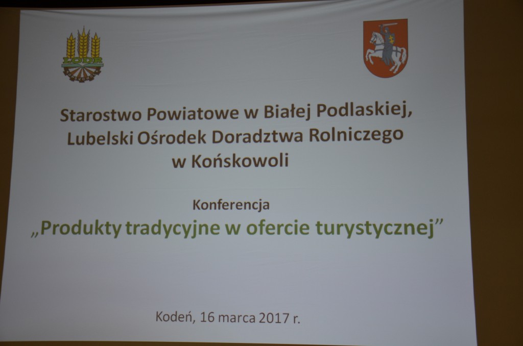 Wydział Spraw Społecznych Starostwa Powiatowego w Białej Podlaskiej i Lubelski Ośrodek Doradztwa Rolniczego zorganizowali w dniu 16 marca 2017 r. w sali konferencyjnej Gminnego Centrum Kultury, Sportu i Turystyki w Kodniu konferencję nt. „Produkty tradycyjne w ofercie turystycznej”. Była ona adresowana do podmiotów zainteresowanych wytwarzaniem tradycyjnych produktów spożywczych, w szczególności do gospodarstw agroturystycznych i innych obiektów turystycznych, dla których wytwarzanie produktów tradycyjnych stanowiłoby poszerzenie oferty turystycznej. Przedsięwzięcie spotkało się z dużym zainteresowaniem. Uczestniczyło w nim ponad 40 osób. Konferencję w imieniu Starosty Bialskiego otworzyła dyrektor Wydziału Spraw Społecznych Starosta Powiatowego w Białej Podlaskiej Marianna Tumiłowicz. Zebranych powitał również gospodarz miejsca Wójt Gminy Kodeń Jerzy Troć, który wyraził uznanie dla podjętej tematyki i podkreślił zasługi mieszkańców Gminy Kodeń w promowaniu produktów tradycyjnych.