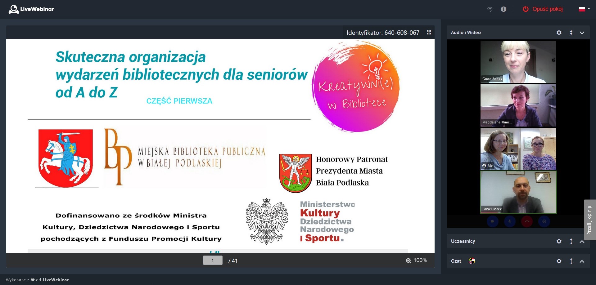„Skuteczna organizacja wydarzeń bibliotecznych dla seniorów od A do Z” to temat szkolenia, które odbyło się 29 i 30 września 2021 r. Poprowadziła je Magdalena Klimczak, animatorka i realizatorka wielu inicjatyw skierowanych do seniorów, zarządzająca Miejską Biblioteką Publiczną w Szczawnie-Zdroju.