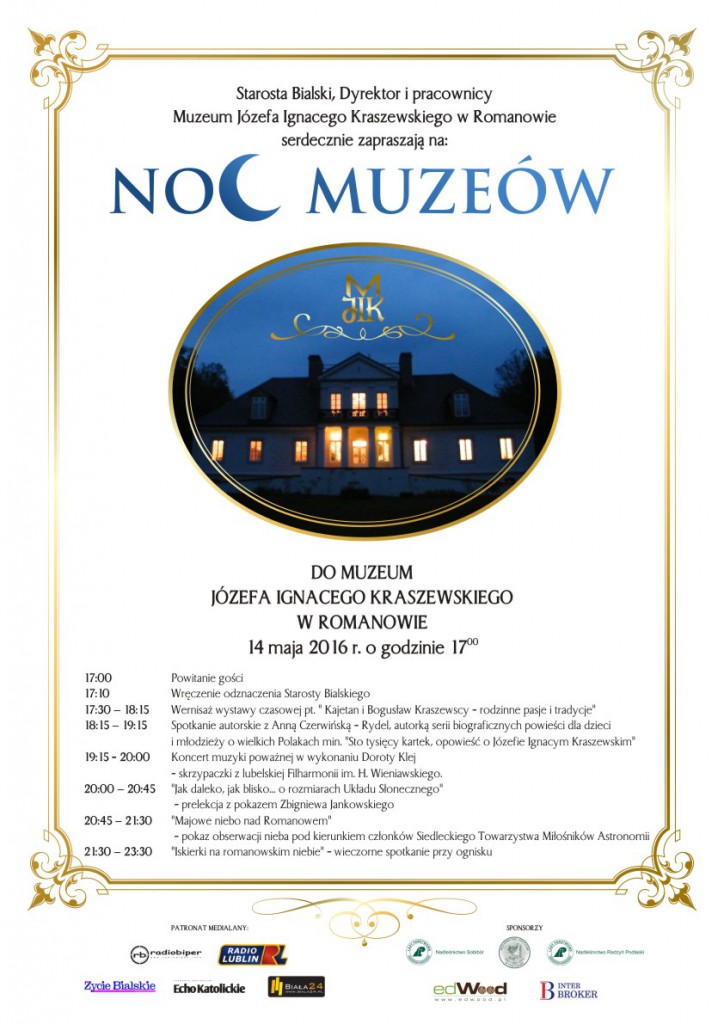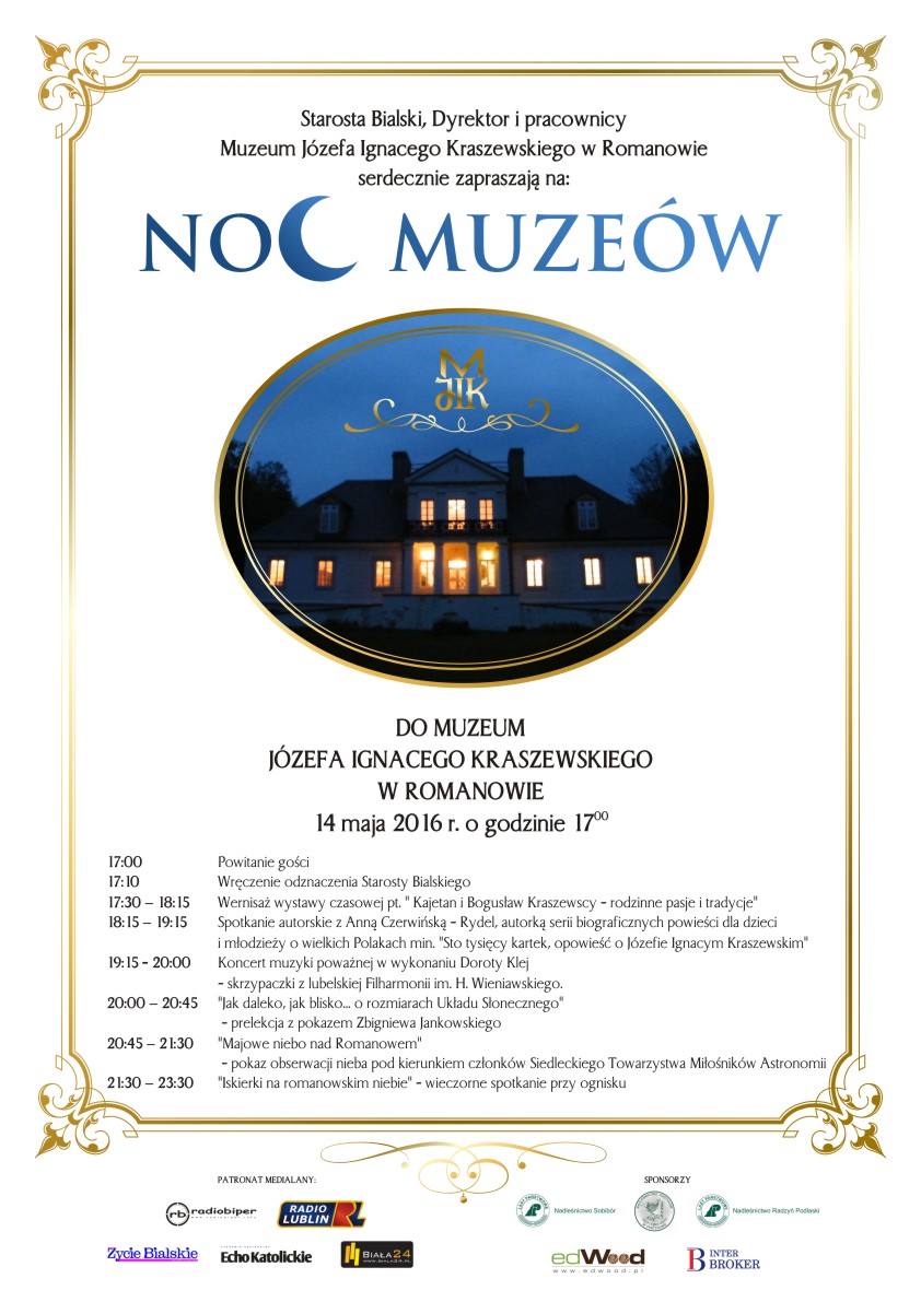 Starosta Bialski oraz dyrektor i pracownicy Muzeum Józefa Ignacego Kraszewskiego w Romanowie serdecznie zapraszają 14 maja 2016 r. na „Noc Muzeów” do Romanowa.