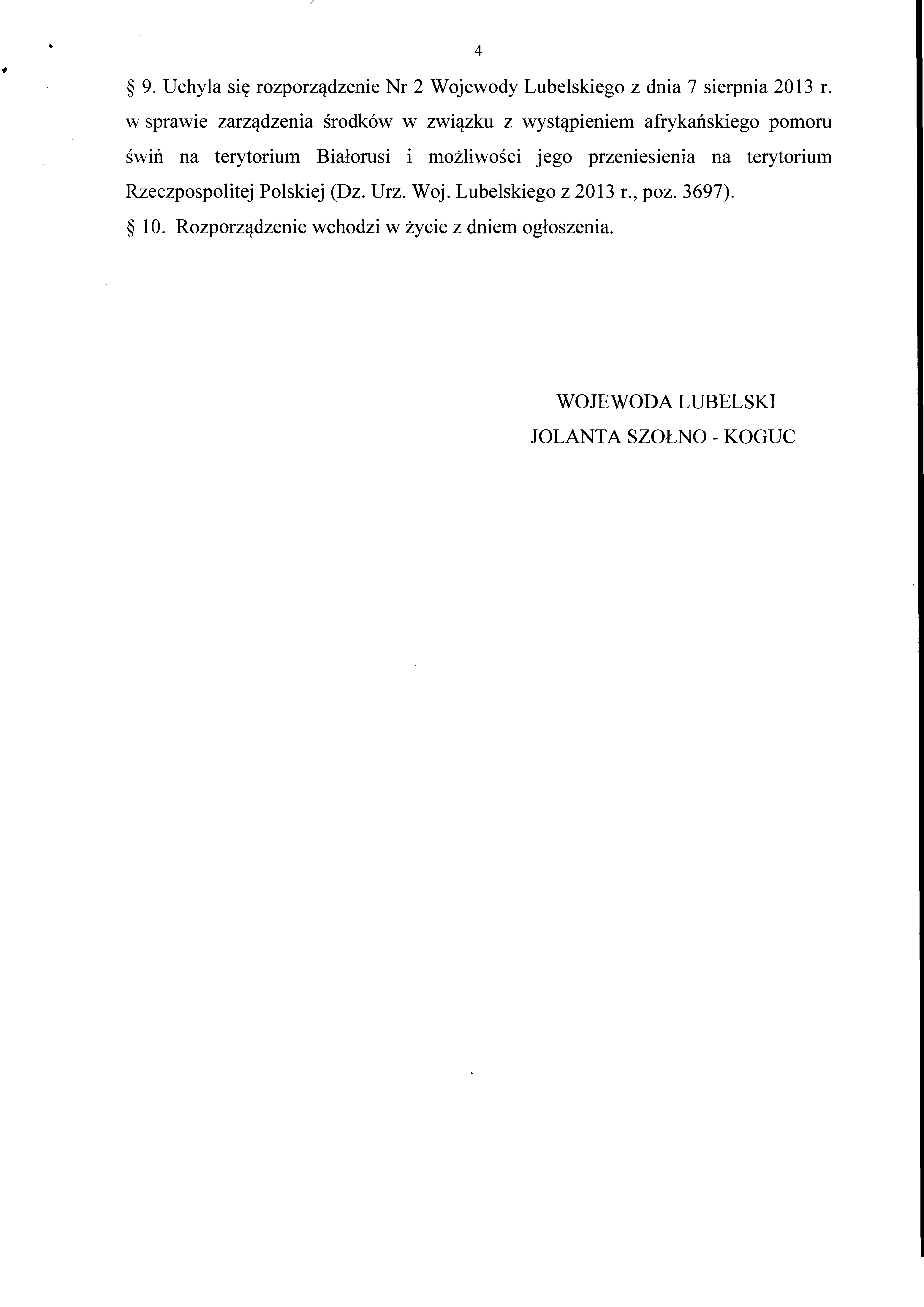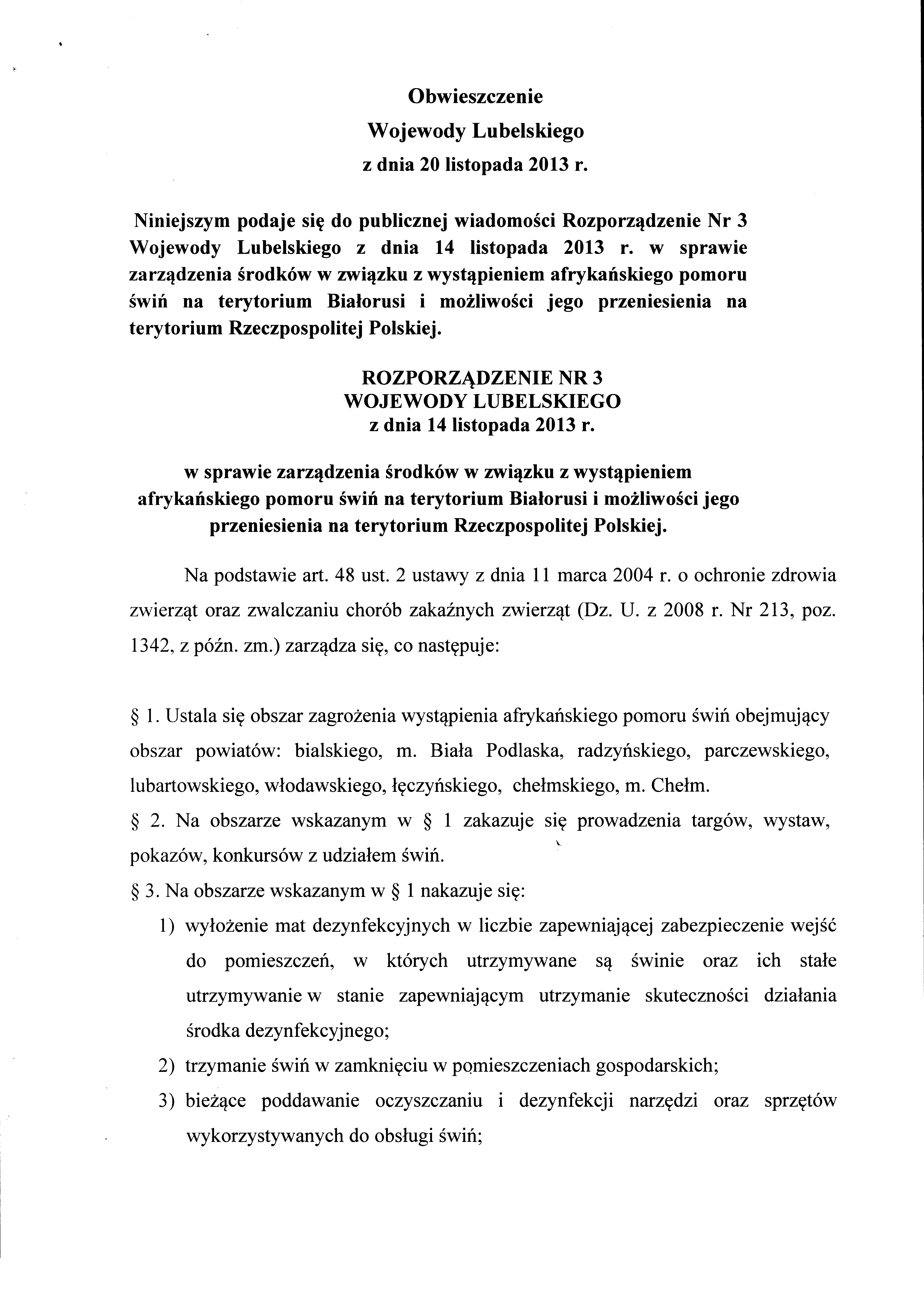 Niniejszym podaje się do publicznej wiadomości Rozporządzenie Nr 3 Wojewody Lubelskiego z dnia 14 listopada 2013 r. w sprawie zarządzenia środków w związku z wystąpieniem afrykańskiego pomoru świń na terenie Białorusi i możliwości jego przeniesienia na terytorium RP.