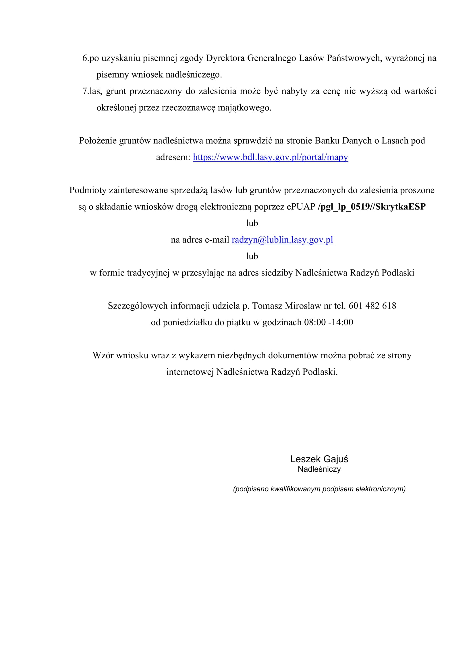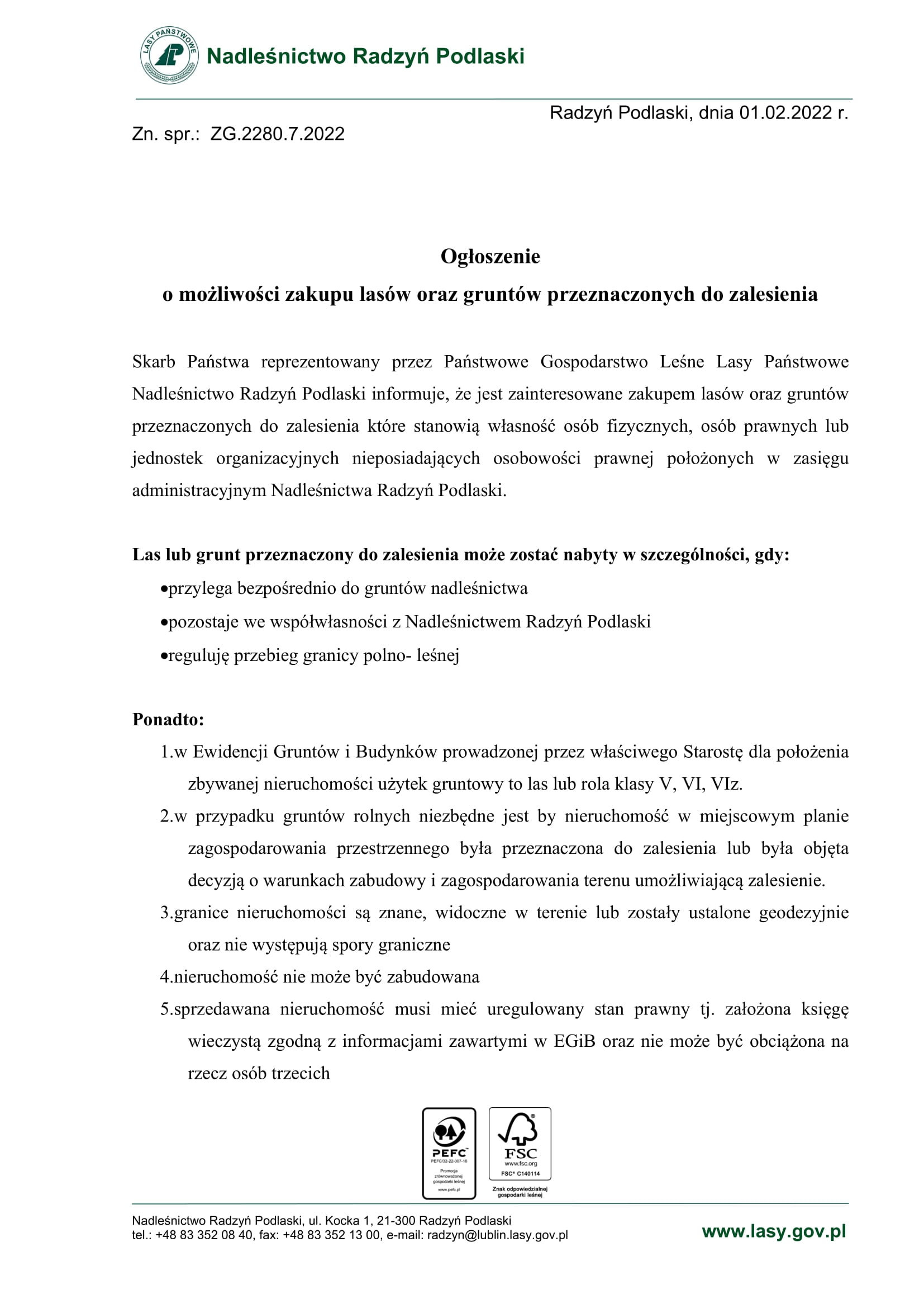 Ogłoszenie Nadleśnictwa Radzyń Podlaski o możliwości zakupu lasów oraz gruntów przeznaczonych do zalesienia 8 lutego 2022 / Przez Karolina Lubańska