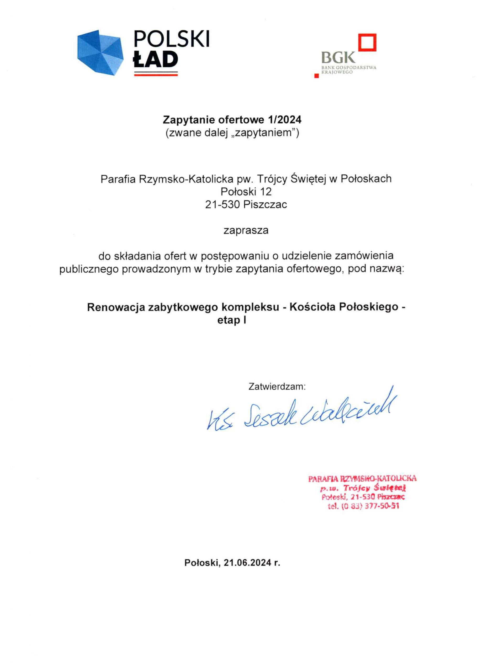 Zgodnie z § 7 ust. 7 Załącznika do uchwały nr 232/2022 Rady Ministrów z dnia 23 listopada 2022 r. szczegółowe zasady i tryb udzielania dofinansowania z Rządowego Programu Odbudowy Zabytków Powiat Bialski zamieszcza ogłoszenie postępowania zakupowego o udzielenie zamówienia w trybie zapytania ofertowego pn. Renowacja zabytkowego kompleksu – Kościoła Połoskiego – etap I prowadzonego przez Parafię Rzymsko-Katolicką pw. Trójcy Świętej z siedzibą w Połoskach. Szczegółowe informacje dotyczące postępowania zawarte są w załącznikach.