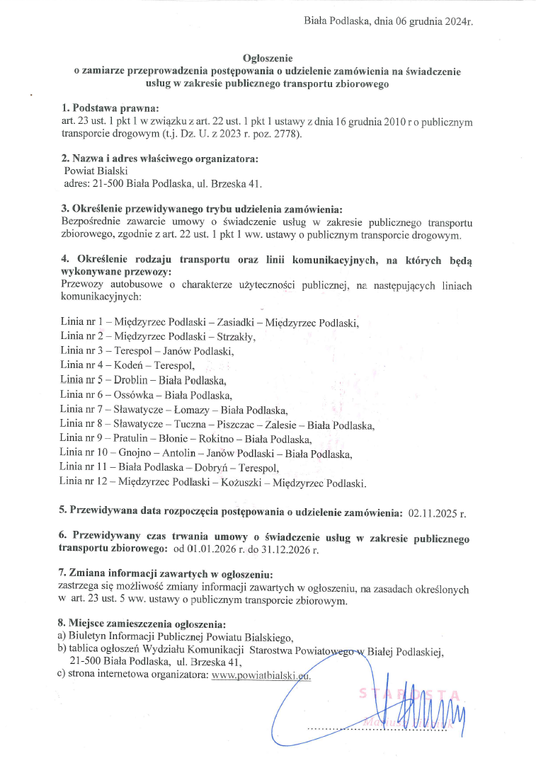 Ogłoszenie o zamiarze przeprowadzenia postępowania o udzielenie zamówienia na świadczenie usług w zakresie publicznego transportu zbiorowego na 2026r. 31 grudnia 2024 / Przez Administrator