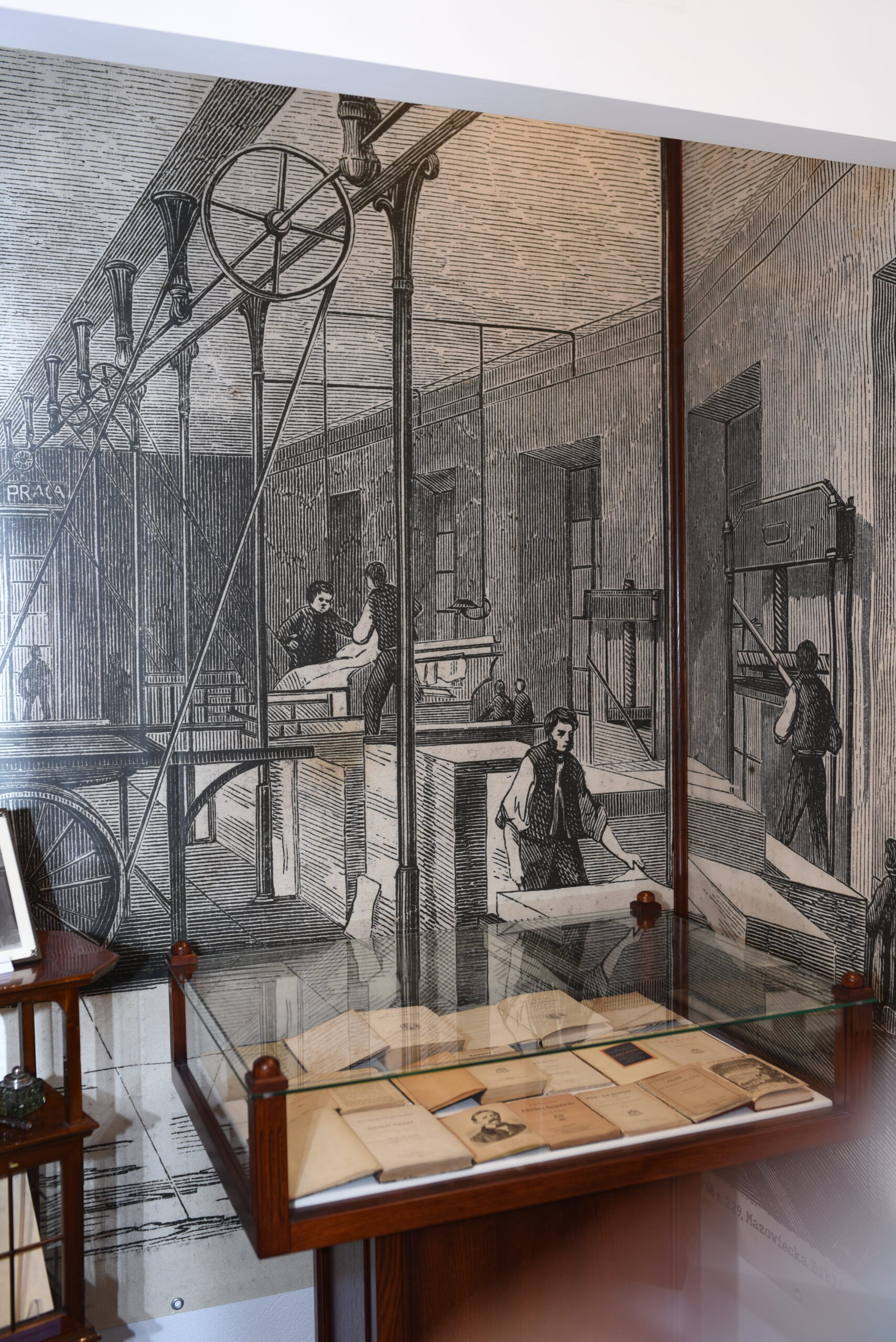 W gablocie – korespondencja pisarza, dotycząca pracy dziennikarskiej i redaktorskiej. Wśród tych listów jest jeden napisany do syna Jana. Uwagę zwraca, powiedzielibyśmy dziś, papier firmowy, z drukarni Kraszewskiego w Dreźnie, bo i taki ważny epizod w życiu autora Starej baśni miał miejsce. W latach w 1868-1871 Kraszewski był przedsiębiorcą – właścicielem drukarni. Zakupił ją w Poznaniu od Zörna i przeniósł ją do Drezna. Wydał w niej 46 utworów, których listę znajdujemy na reprodukcji fotograficznej na jednej ze ścian. Zamieszczono również listę pracowników owej drukarni. W 1871 roku Kraszewski drukarnię sprzedał doktorowi Władysławowi Łubieńskiemu, a ten przeniósł ją do Poznania. Ukazała się Pamiątka drukarni J. I. Kraszewskiego w Dreźnie, pióra właściciela, a prezentowane reprodukcje pochodzą z tej właśnie broszury. Oryginał pokazano w małej witrynce w głębi sali. W gablocie i przeszklonej bibliotece wyeksponowano przykłady dzieł wydanych w drukarni. Uzupełnieniem ekspozycji jest godło drukarni oraz jej hasło, którego tłumaczenie brzmi: szponami i dziobem.