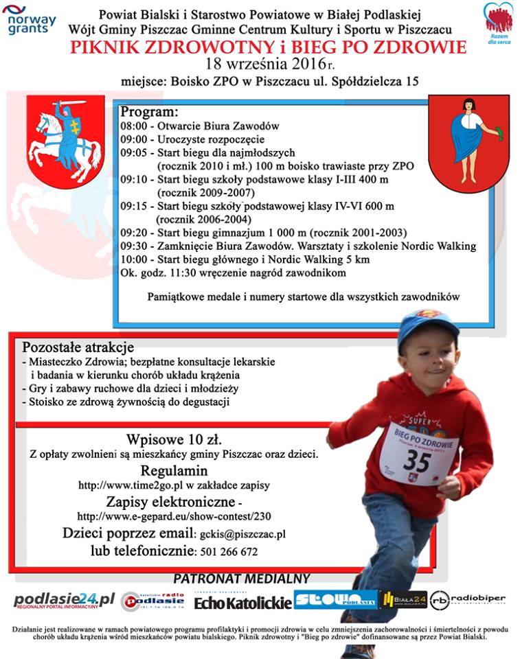 Powiat Bialski – Starostwo Powiatowe w Białej Podlaskiej oraz Wójt Gminy Piszczac i Gminne Centrum Kultury i Sportu w Piszczacu serdecznie zapraszają miłośników sportu i zdrowej żywności na Piknik Zdrowotny oraz imprezę biegową pn. BIEG PO ZDROWIE, który odbędzie się 18 września 2016 r . na boisku ZPO w Piszczacu przy ul. Spółdzielczej 15.