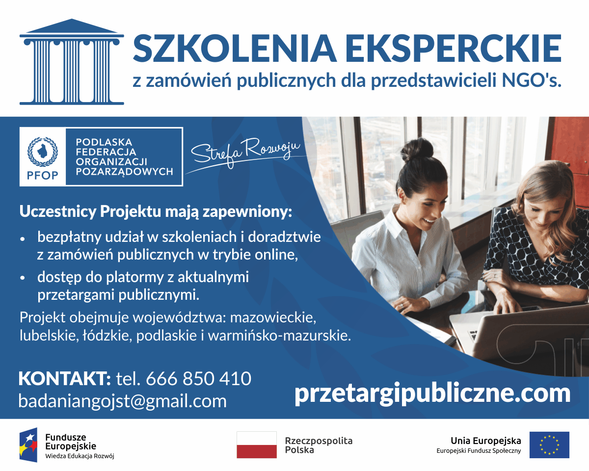 Zapraszamy do udziału w naszym projekcie pt. ,,Szkolenie eksperckie dla Podmiotów Ekonomii Społecznej z zakresu zamówień publicznych w województwie podlaskim, warmińsko-mazurskim, lubelskim, mazowieckim i łódzkim.”