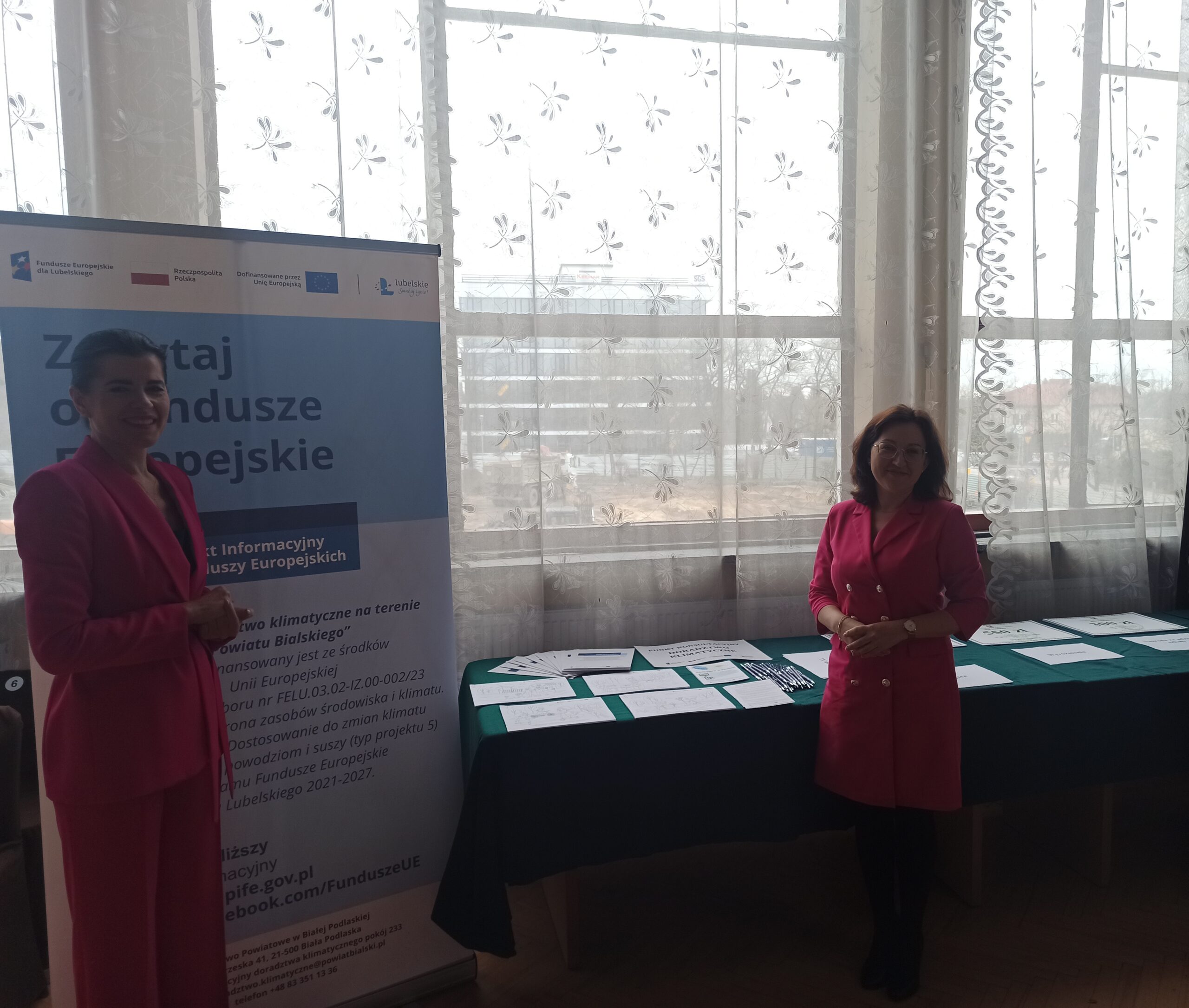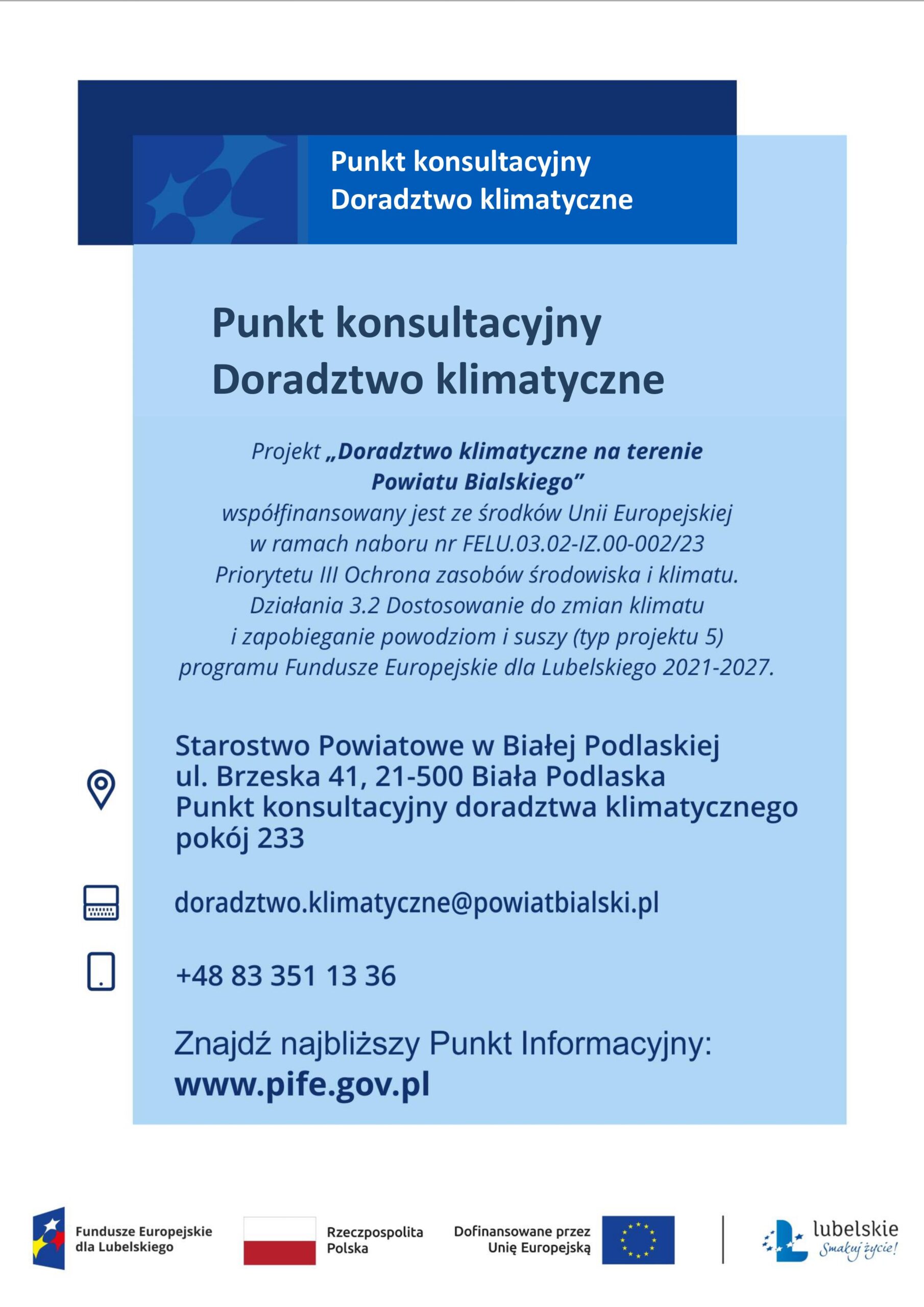 Od 1 stycznia 2024 r. powiat bialski realizuje projekt pt.: „Doradztwo klimatyczne na terenie Powiatu Bialskiego”, współfinansowany ze środków Unii Europejskiej w ramach naboru nr FELU.03.02-IZ.00-002/23 Priorytetu III Ochrona zasobów środowiska i klimatu, Działania 3.2 Dostosowanie do zmian klimatu i zapobieganie powodziom i suszy (typ projektu 5) programu Fundusze Europejskie dla Lubelskiego 2021-2027.