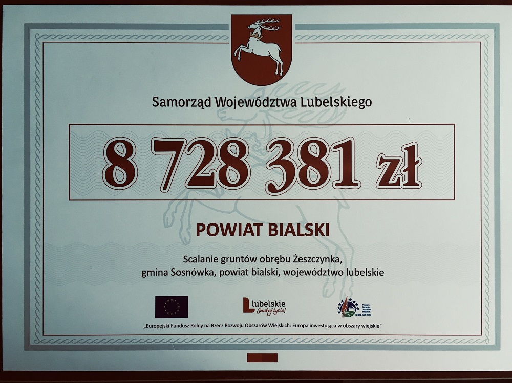 W dniu 09 października 2019 r. została podpisana umowa pomiędzy Samorządem Województwa Lubelskiego a Powiatem Bialskim o przyznaniu pomocy na scalanie gruntów w ramach poddziałania „Wsparcie na inwestycje związane z rozwojem, modernizacją i dostosowywaniem rolnictwa i leśnictwa” objętego Programem Rozwoju Obszarów Wiejskich na lata 2014-2020. Umowa dotyczy scalenia gruntów obrębu Żeszczynka w gminie Sosnówka. Przyznana Powiatowi Bialskiemu w/w umową kwota pomocy ze środków EFRROW w formie refundacji wynosi 8 728 381 zł, która widnieje na symbolicznym czeku. Całkowity koszt operacji wynosi 13 717 401 zł w tym: koszty prac scaleniowych 4 518 673 zł i koszty zagospodarowania poscaleniowego 9 198 728 zł. Jeszcze w miesiącu październiku 2019 r. zostanie podpisana umowa pomiędzy Powiatem Bialskim a Wojewódzkim Biurem Geodezji w Lublinie na wykonanie prac scaleniowych na wyżej wymienionym obiekcie. Powierzchnia objęta scaleniem wynosi 1613,8119 ha a termin zakończenia prac określono na 31 maja 2022 r. Po zakończeniu prac scaleniowych i sporządzeniu dokumentacji geodezyjno-prawnej realizowane będzie zagospodarowanie poscaleniowe w tym: budowa i przebudowa dróg.