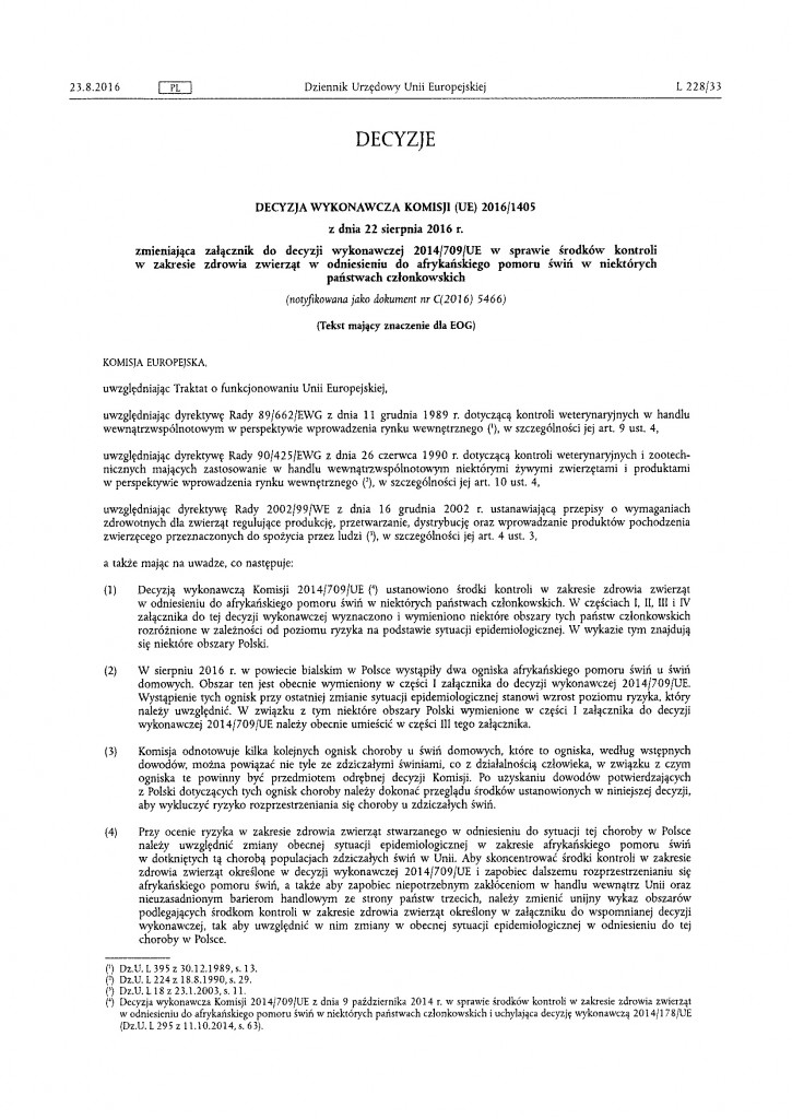 Powiatowy Lekarz Weterynarii przesyła Decyzję Wykonawczą Komisji (UE) 2016/1405 23 sierpnia 2016 / Przez Anna Jóźwik decyzja UE-ASF
