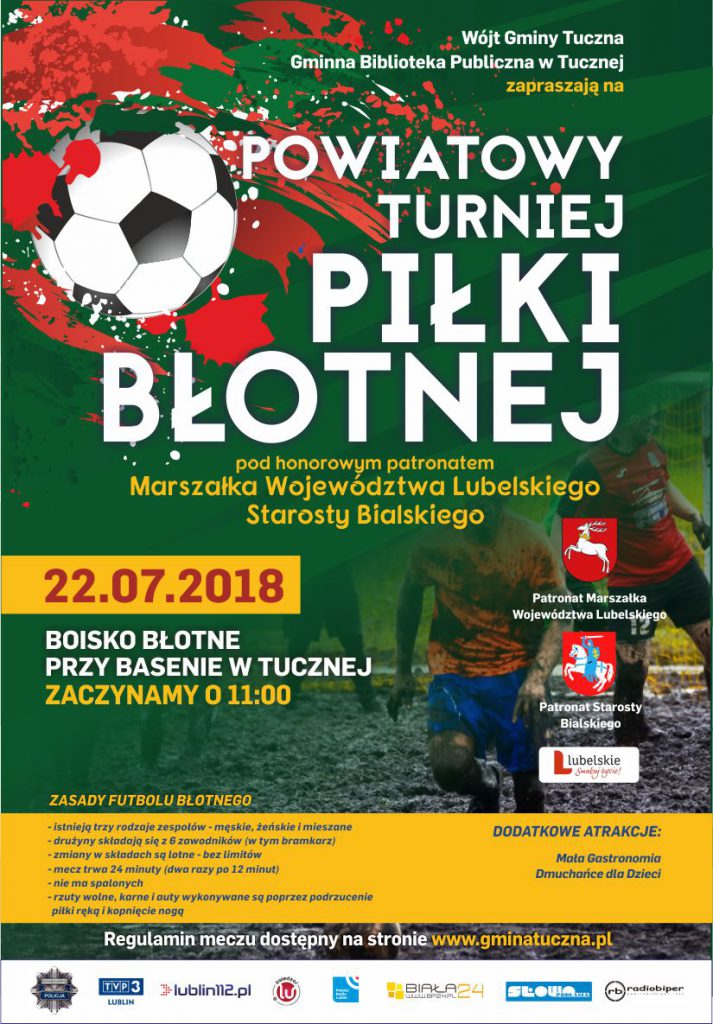 Starosta Bialski, Wójt Gminy Tuczna i Gminna Biblioteka Publiczna w Tucznej zapraszają do uczestnictwa dnia 22.07.2018 r. w Powiatowym Turnieju Piłki Błotnej w Tucznej. Początek Turnieju jest zaplanowany na godz. 11.00. Mile widziani są również kibice.