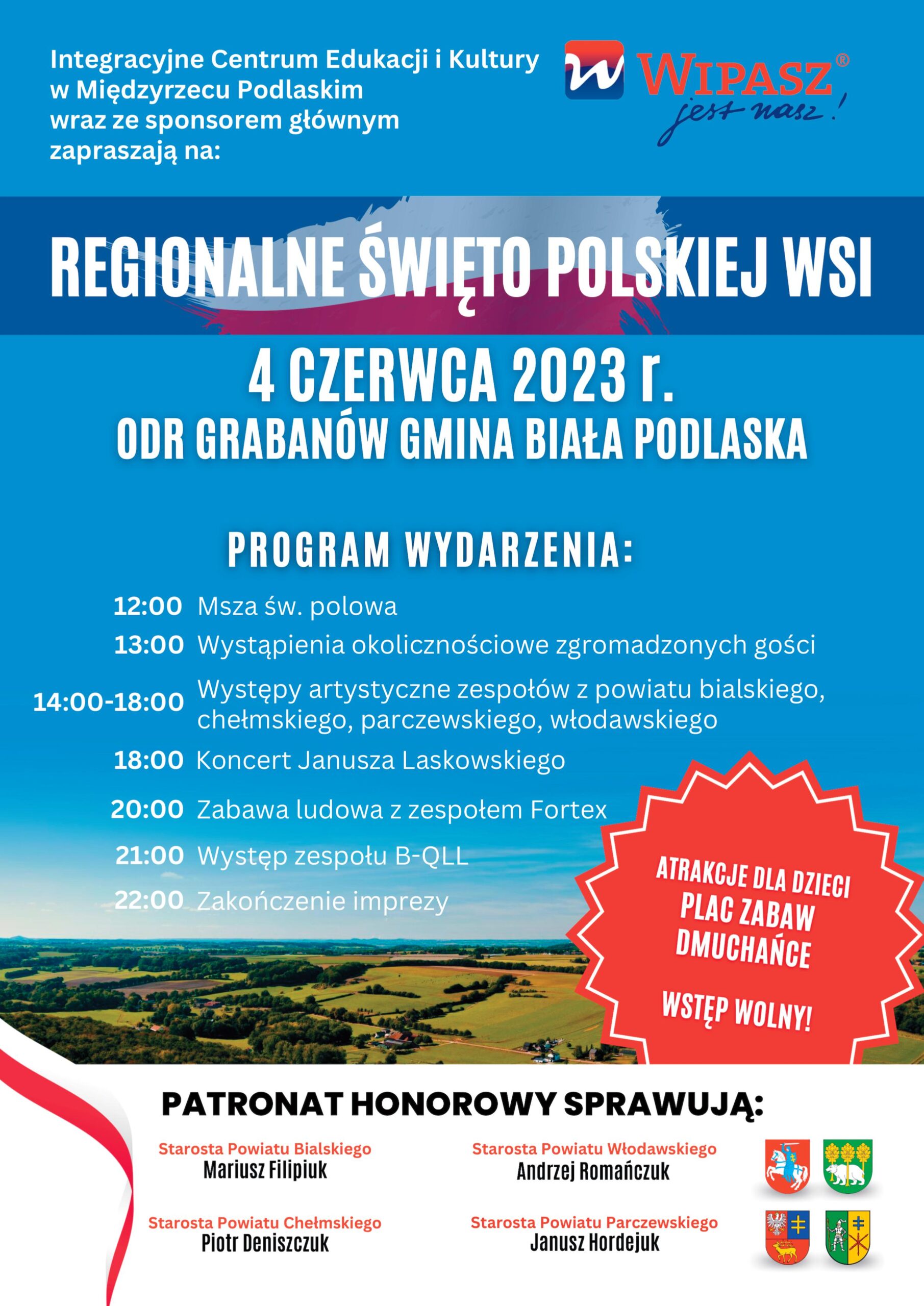 Integracyjne Centrum Edukacji i Kultury w Międzyrzecu Podlaskim zaprasza na Regionalne Święto Polskiej Wsi, które odbędzie się 4 czerwca 2023 r. na terenie Ośrodka Doradztwa Rolniczego w Grabanowie gmina Biała Podlaska. Patronat Honorowy nad wydarzeniem sprawują: