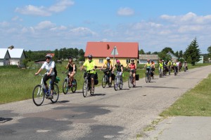 Po wysłuchaniu krótkiej prelekcji o malarzu, kolumna ruszyła w dalszą drogę. Wszystkie odwiedzane miejsca na trasie dla wielu uczestników było nowością, spora grupa osób, była zachwycona i wręcz zdziwiona, że na Południowym Podlasiu jest tyle ciekawych atrakcji. Mimo niemałej liczbowo grupy, mieliśmy dobre tempo jazdy i widać było, że chyba każdemu jazda sprawiała frajdę, bo czy niema nic piękniejszego niż nieśpieszne przemieszczanie się wśród przepięknej podlaskiej przyrody pełnej koloru i zapachów, obrazków mijanych wsi i miasteczek, urokliwego wschodniego klimatu? Obserwując nie dało się nie zauważyć na twarzach towarzyszy rowerowej włóczęgi, uśmiechu i zadowolenia.