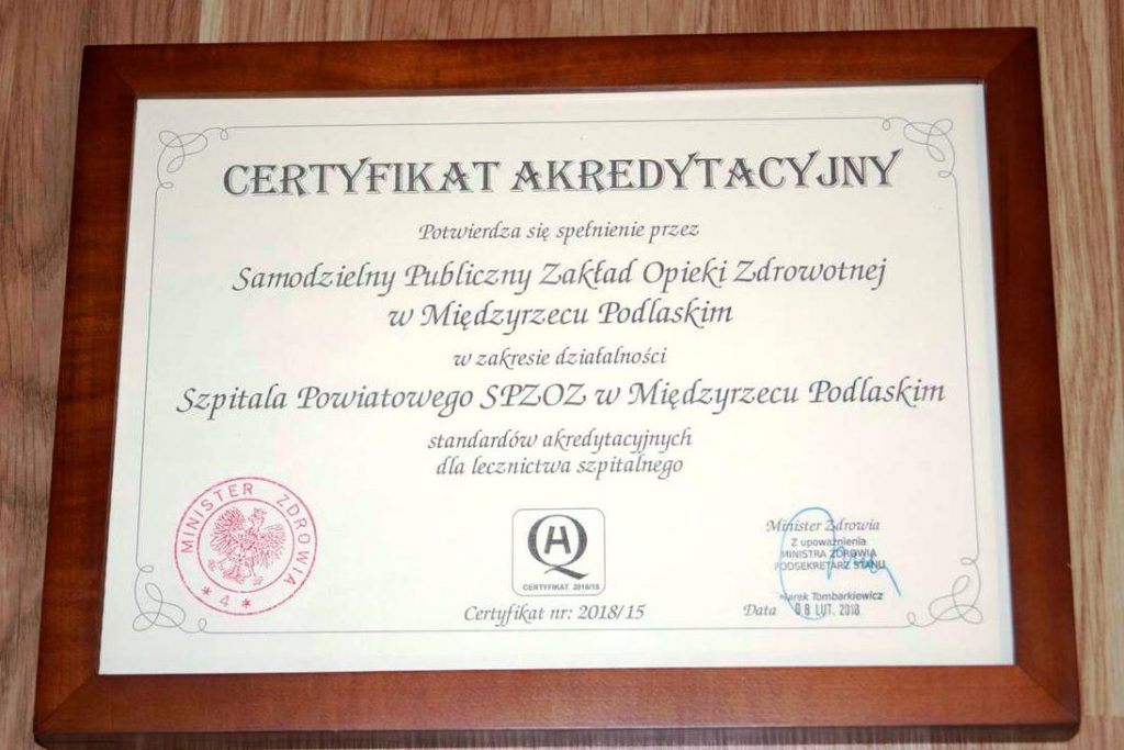 Samodzielny Publiczny Zakład Opieki Zdrowotnej w Międzyrzecu Podlaskim otrzymał od Ministra Zdrowia akredytację w zakresie działalności Szpitala Powiatowego SP ZOZ w Międzyrzecu Podlaskim. Została ona wydana na podstawie rekomendacji Rady Akredytacyjnej wyrażonej w uchwale nr 8/2018 z dnia 26 stycznia 2018 r., w związku z art. 3 ust. 3 ustawy z dnia 6 listopada 2008 r. o akredytacji w ochronie zdrowia.