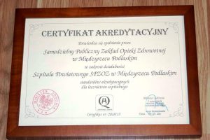 W wyniku dokonanej oceny punktowej szpital uzyskał Certyfikat Akredytacyjny przyznany na okres 3 lat, ważny do 7 lutego 2021 roku, w zakresie standardów akredytacyjnych określonych obwieszczeniem Ministra Zdrowia z dnia 18 stycznia 2010 r. w sprawie standardów akredytacyjnych w zakresie udzielania świadczeń zdrowotnych oraz funkcjonowania szpitali.