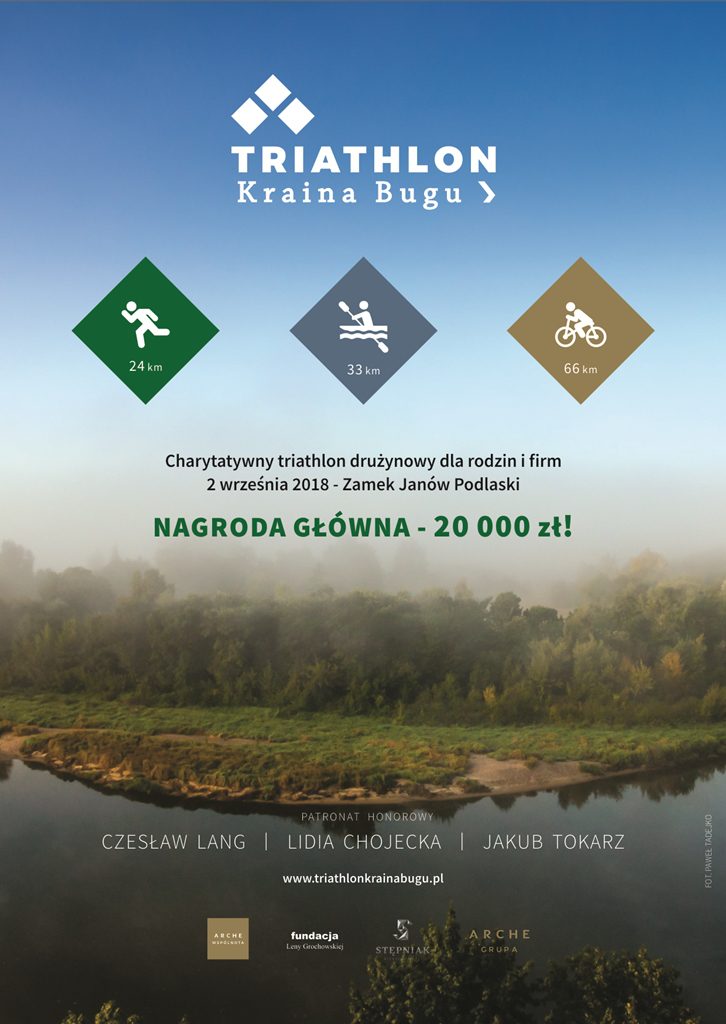 Serce Podlasia bije dla osób niepełnosprawnych 2 września 2018 roku. Poprzez tereny nadbużańskie przebiegnie trasa TRIATHLONU KRAINA BUGU, nietypowego bo drużynowego skierowanego zarówno do rodzina jak i firm. A cel to nie tylko propagowanie zdrowego stylu życia i zachęcanie do aktywności fizycznej, ale przede wszystkim pozyskanie funduszy na utworzenie mieszkań chronionych dla osób niepełnosprawnych.