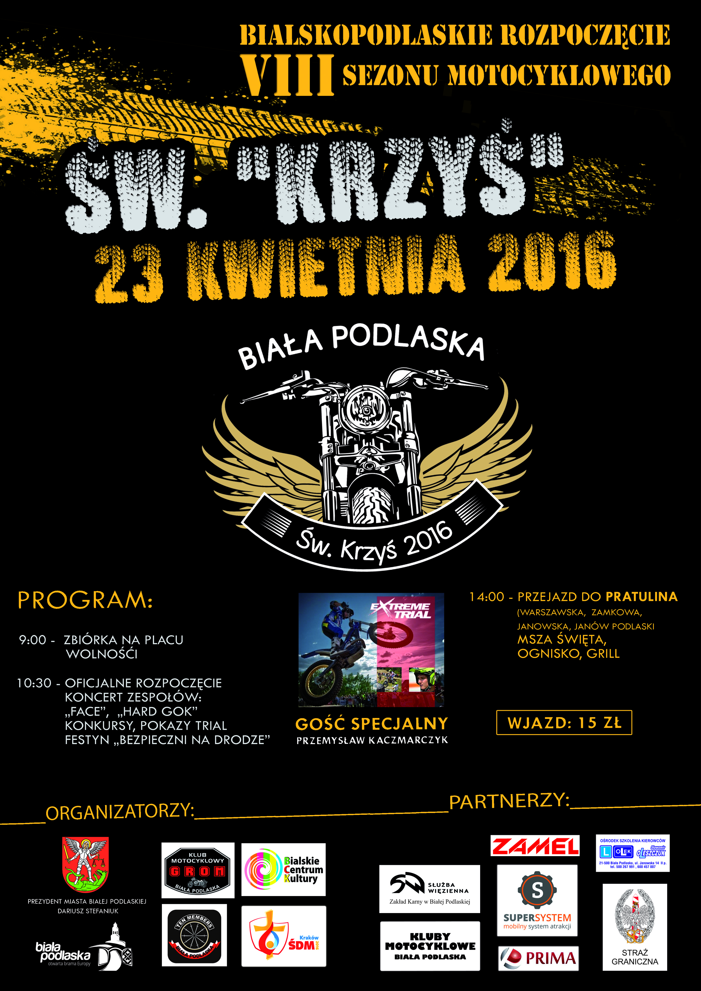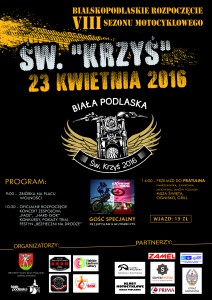 Wszystkich miłośników motocykli informujemy, że Rozpoczęcie Sezonu „Św. Krzyś” w tym roku odbędzie się 23 kwietnia. Początek przedsięwzięcia w Białej Podlaskiej a zakończenie w Pratulinie. Zapraszamy!
