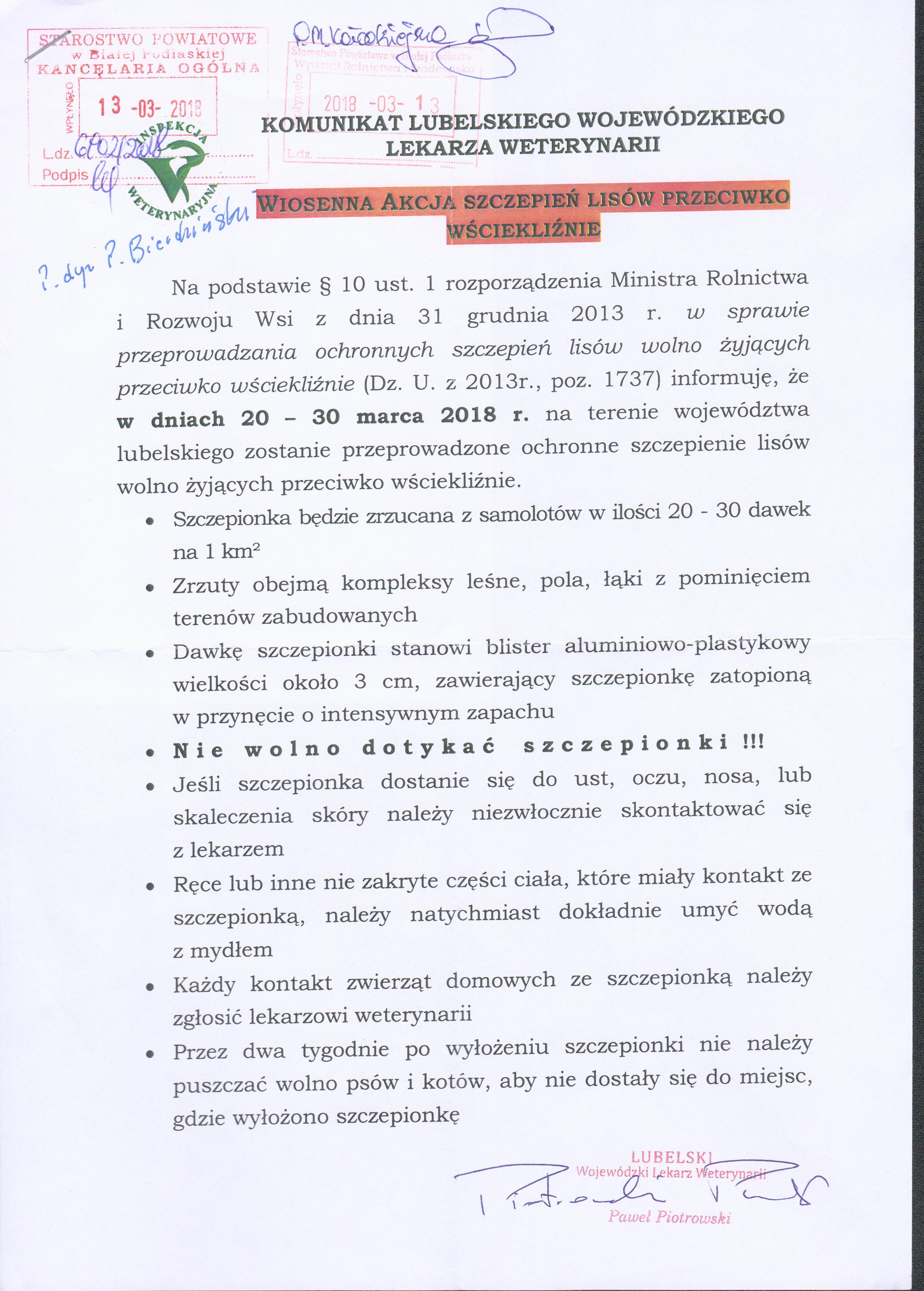 Wiosenna akcja szczepień lisów przeciwko wściekliźnie 16 marca 2018 / Przez Małgorzata Kołodziejska Komunikat Lubelskiego Wojewódzkiego Lekarza Weterynarii dotyczący wiosennej akcji szczepień lisów przeciwko wściekliźnie w dniach 20-30 marca 2018 r. na terenie województwa lubelskiego.