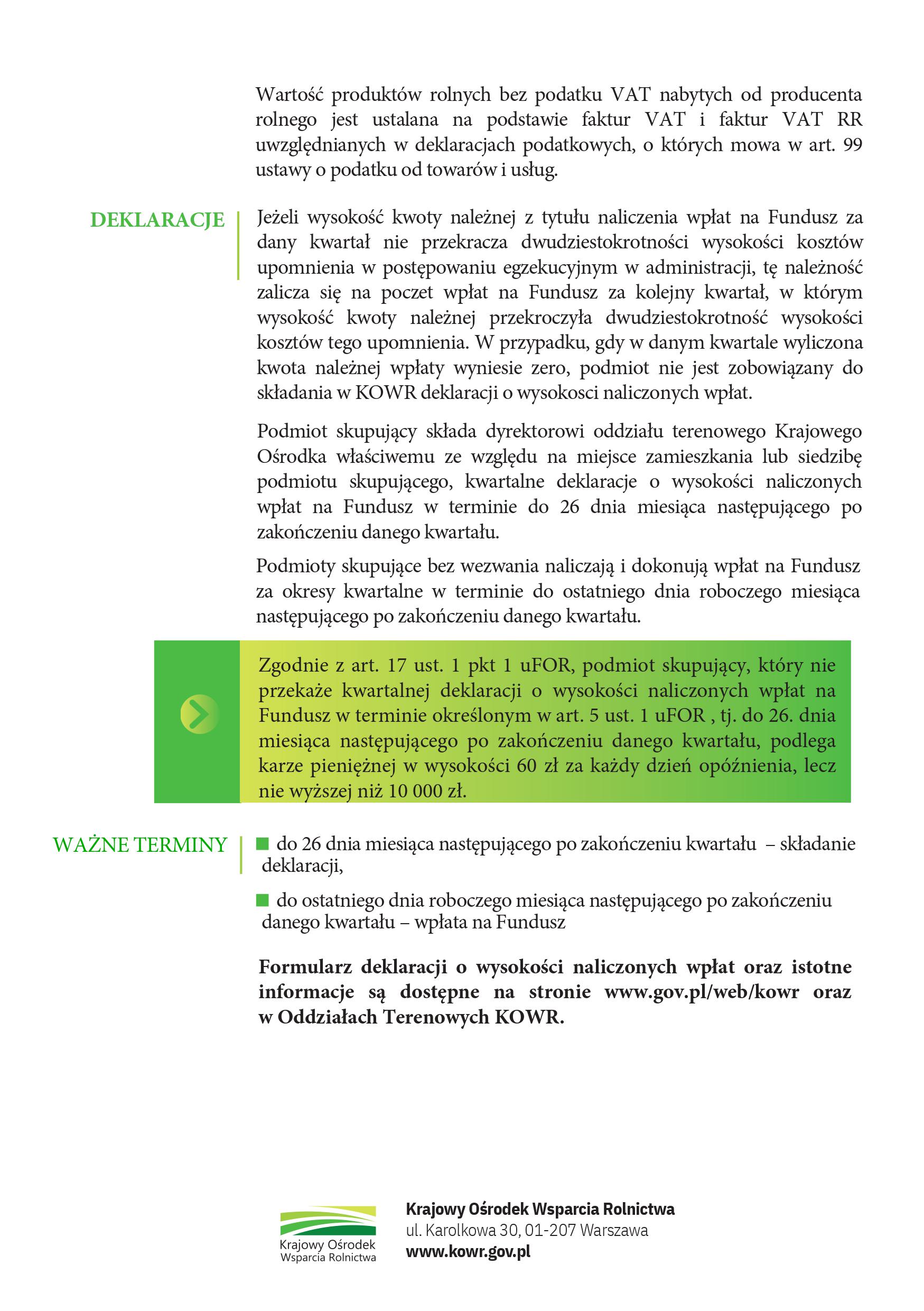Z upoważnienia Dyrekcji Oddziału Terenowego Krajowego Ośrodka Wsparcia Rolnictwa w Lublinie, w nawiązaniu do poniżej informacji przekazanej w dniu 21.02.2024 r. przypominam, że z dniem jutrzejszym tj. 26.04.2024 r. upływa termin na złożenie deklaracji o wysokości naliczonych wpłat na Fundusz Ochrony Rolnictwa.