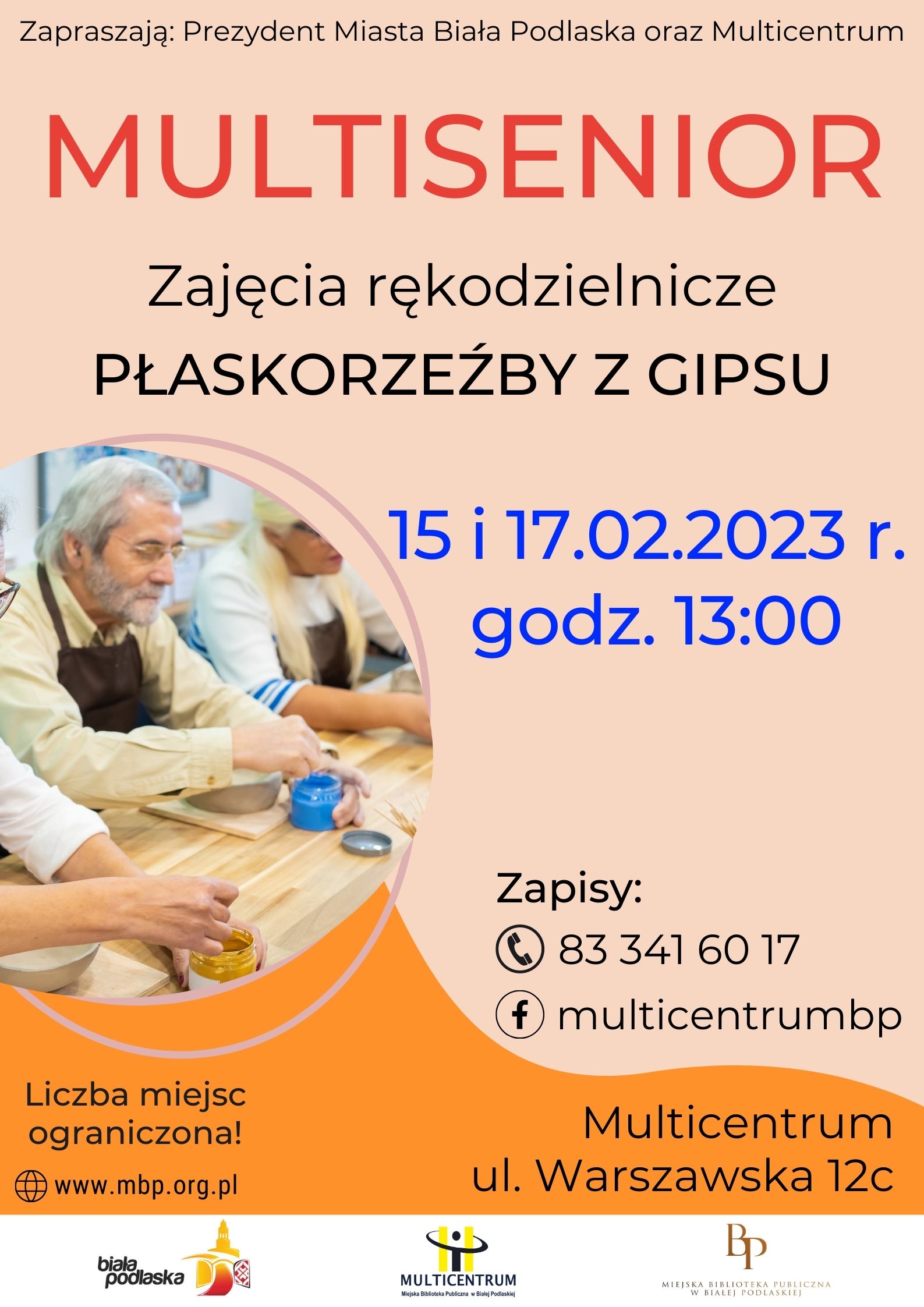 15 i 17 lutego 2023 r. w Multicentrum o godz. 13:00 odbędą się warsztaty rękodzielnicze dla seniorów. Podstawowym materiałem wykorzystanym podczas warsztatów będzie gips, który uczy cierpliwości, wspomaga koncentrację rozwija ekspresję twórczą i uwrażliwia na piękno. Motywem przewodnim będą obrazy roślinne na płaskorzeźbie. Uczestnicy otrzymają gips oraz narzędzia do pracy. Spotkania będą także okazją do zawierania nowych znajomości z osobami, które łączy wspólna pasja. W twórczej atmosferze każdy może wykonać coś pięknego dla siebie lub na prezent. Warsztaty poprowadzi doświadczony instruktor Multicentrum Pani Agata Filipek, która niejednokrotnie prowadziła w Multicentrum ciekawe zajęcia kreatywne z dziećmi i młodzieżą. Na zajęcia obowiązują zapisy.