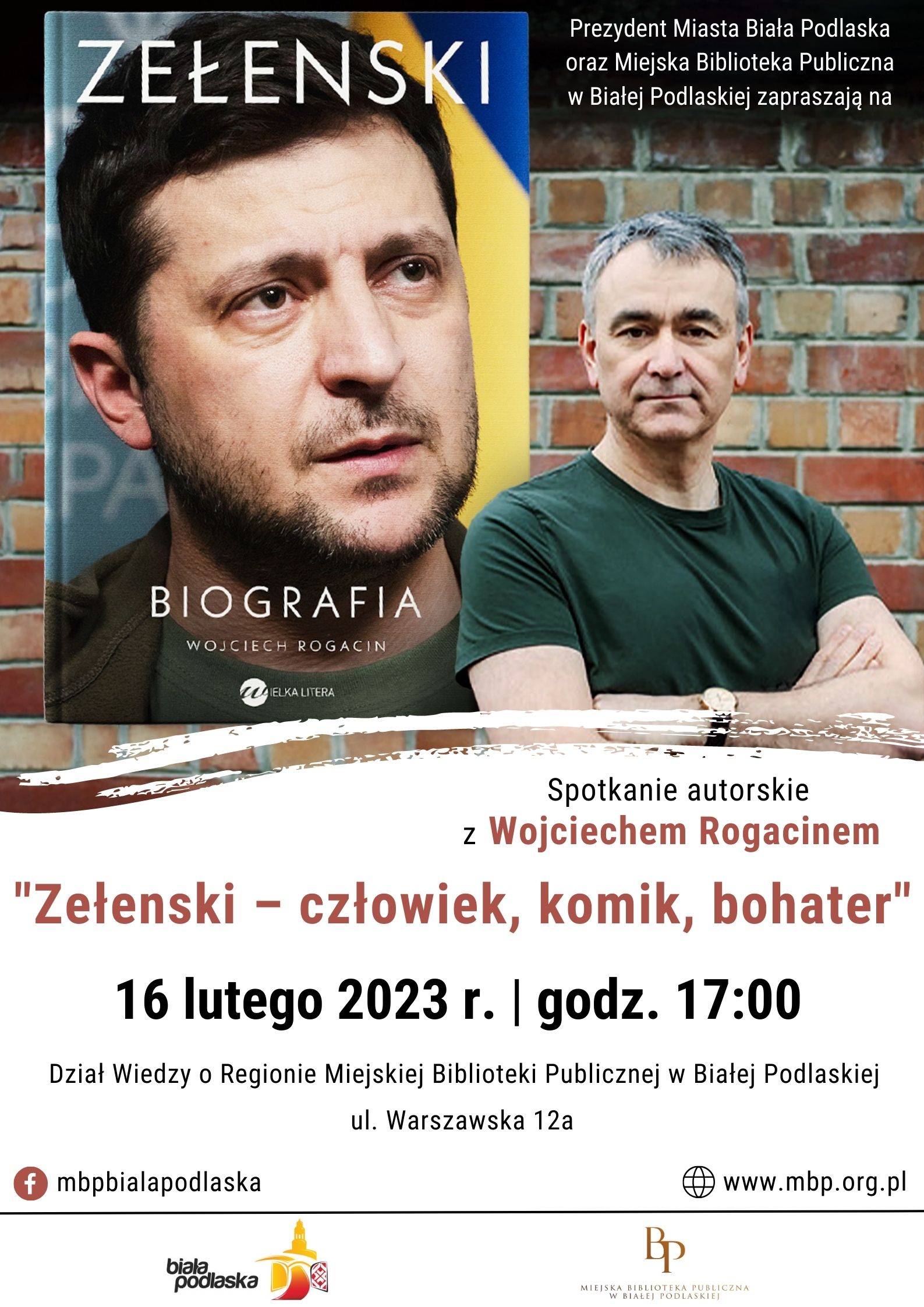 16 lutego 2023 r. o godz. 17:00 w Dziale Wiedzy o Regionie odbędzie się spotkanie autorskie z Wojciechem Rogacinem pt. „Zełenski – człowiek, komik, bohater”. Książka „Zełenski” wydana przez wydawnictwo Wielka Litera jest pełną biografią prezydenta Ukrainy od jego urodzenia do pierwszych miesięcy wojny i poprzez wszystkie etapy jego życia, relacje rodzinne, szkołę, uczelnię, karierę artystyczną i polityczną pokazuje, jak kształtował się ten człowiek, który dziś jest bohaterem Ukrainy i świata. Książka została w listopadzie nominowana do Nagrody im. Beaty Pawlak, oraz obecnie do tytułu biograficznej Książki Roku w plebiscycie portalu Lubimyczytać.pl. Autor niniejszej książki – Wojciech Rogacin obecnie jest redaktorem naczelnym „Polski Metropolii Warszawskiej” (Polska Times). Wcześniej był m.in. dziennikarzem działów zagranicznych Gazety Wyborczej i Newsweeka, zajmował się krajami powstałymi po upadku ZSRR, kwestiami związanymi z USA, NATO, był także korespondentem z wojny w Iraku i innych miejsc na świecie. Pan Wojciech jest również współautorem książki „Korespondenci.pl” o pracy polskich korespondentów wojennych.