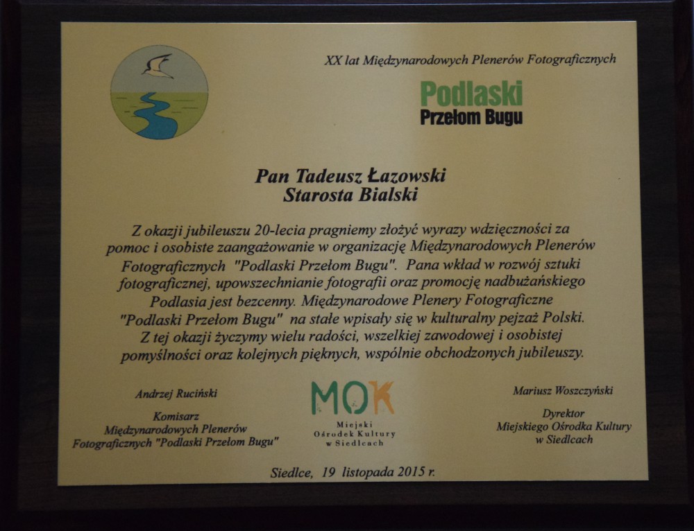 Już po raz 20. mieszkańcy Białej Podlaskiej i powiatu mają możliwość podziwiać prace wykonane przez fotografików z Polski i Ukrainy. Otwarcie wystawy poplenerowej miało miejsce 29 stycznia w Bialskim Centrum Kultury. Wyjątkowe zdjęcia pokazujące krajobraz, ludzi, wydarzenia związane z Podlaskiem to efekt XX Międzynarodowego Pleneru Fotograficznego „Podlaski Przełom Bugu 2015”. Plener, który odbył się od 7 do 12 czerwca w Janowie Podlaskim należy do najważniejszych imprez tego typu w kraju. Jego organizatorem jest Miejski Ośrodek Kultury w Siedlcach, natomiast współorganizacji podjęło się Bialskie Centrum Kultury, a w sposób szczególny działający w nim Podlaski Fotoklub. Wystawa była także okazją do podziękowania tym, za których przyczyną plener może się co roku odbywać. Podziękowanie w postaci grawertonu podczas wernisażu otrzymał m.in. starosta bialski Tadeusz Łazowski. Starostwo Powiatowe w Białej Podlaskiej bowiem od kilku lat wspiera finansowo to przedsięwzięcie.