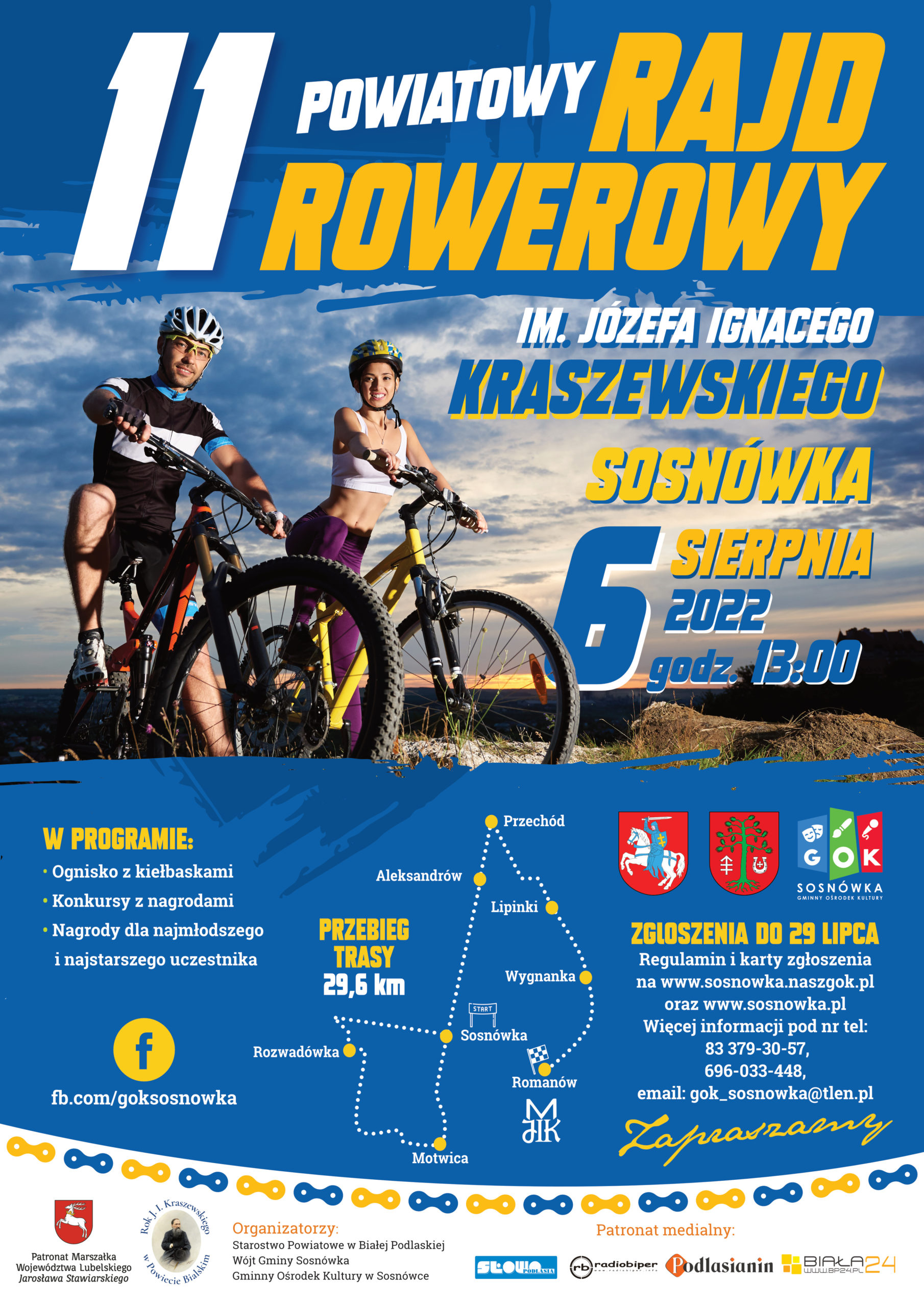 Starostwo Powiatowe w Białej Podlaskiej, Wójt Gminy Sosnówka oraz Gminny Ośrodek Kultury w Sosnówce serdecznie zapraszają wszystkich miłośników aktywnego wypoczynku na XI Powiatowy Rajd Rowerowy im. J.I. Kraszewskiego, który odbędzie się 6 sierpnia 2022 r. Zgłoszenia do 29 lipca 2022 r.