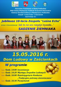 W imieniu organizatorów, którymi są Starostwo Powiatowe w Białej Podlaskiej, Urząd Gminy Międzyrzec Podlaski, Gminny Ośrodek Kultury w Międzyrzecu Podlaskim serdecznie zapraszamy sołectwa, Koła Gospodyń Wiejskich, zespoły ludowe lub inne organizacje działające w danej wsi, a także osoby indywidualne z terenu powiatu bialskiego do wzięcia udziału w Konkursie na „Tradycyjne potrawy ziemniaczane”. Odbędzie się on na placu przy Domu Ludowym w Zaściankach 15 maja 2016 r. Szczegóły w poniższym regulaminie.