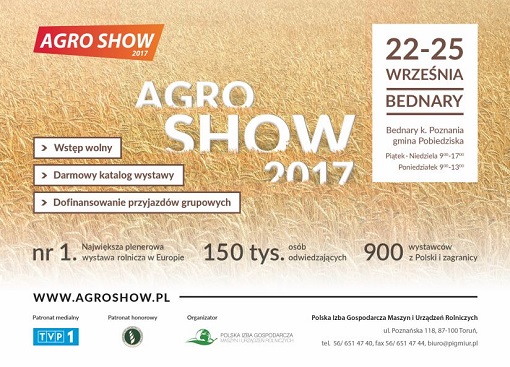 Polska Izba Gospodarcza Maszyn i Urządzeń Rolniczych zaprasza na XVIII Międzynarodową Wystawę Rolniczą Agro Show, która odbędzie się 22-25 września 2017 roku na terenie lotniska Bednary k. Poznania (gm. Pobiedziska).